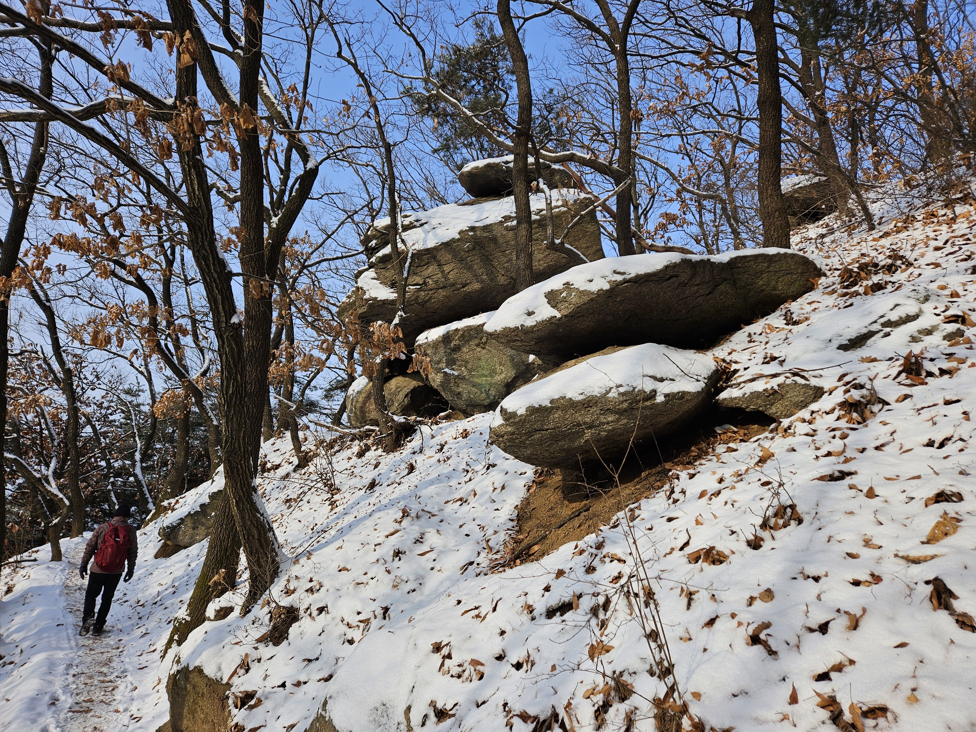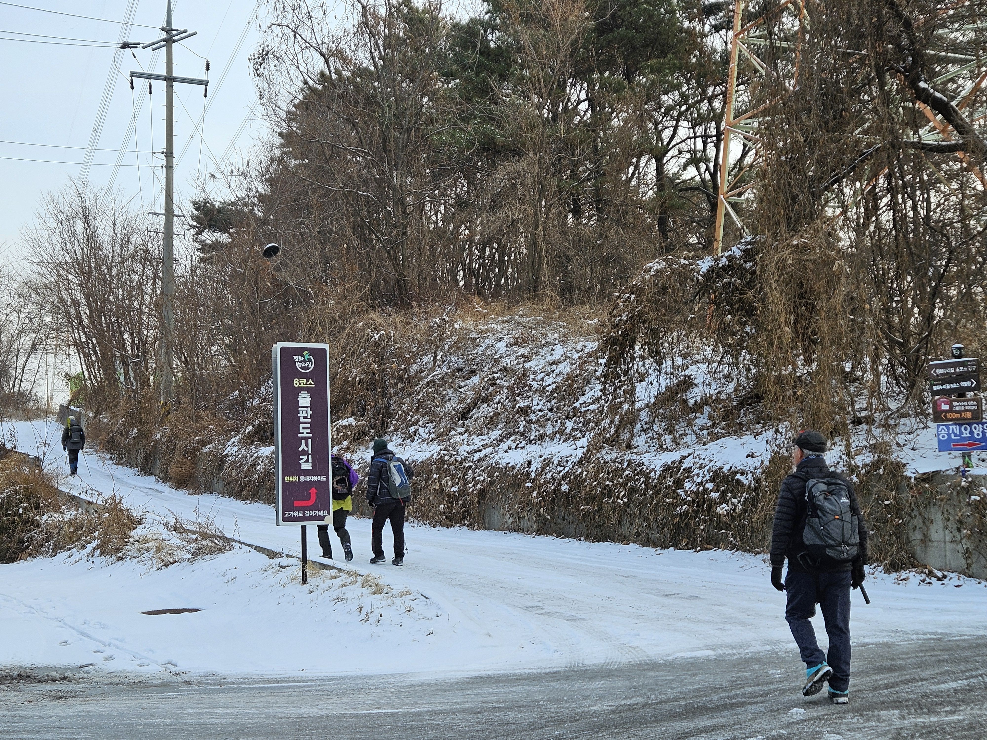 서울서 달린 거리 가까워서 아침 8시 지나자 마자 하차... 산악회서 당일 트레킹 이렇게 이른 시간에 출발 해 보기는 첨? 근데 어제 잠깐 내린눈으로 시야는 온통 하얀색으로...조금 춥다는 느낌이 들었지만 열심히 걷다보니 기온도 오르고 내몸 기온도 올라 걷기는 딱 좋았는데 눈길이 미끄러워 산행 내내 맘을 놓을수가 없었답니다.