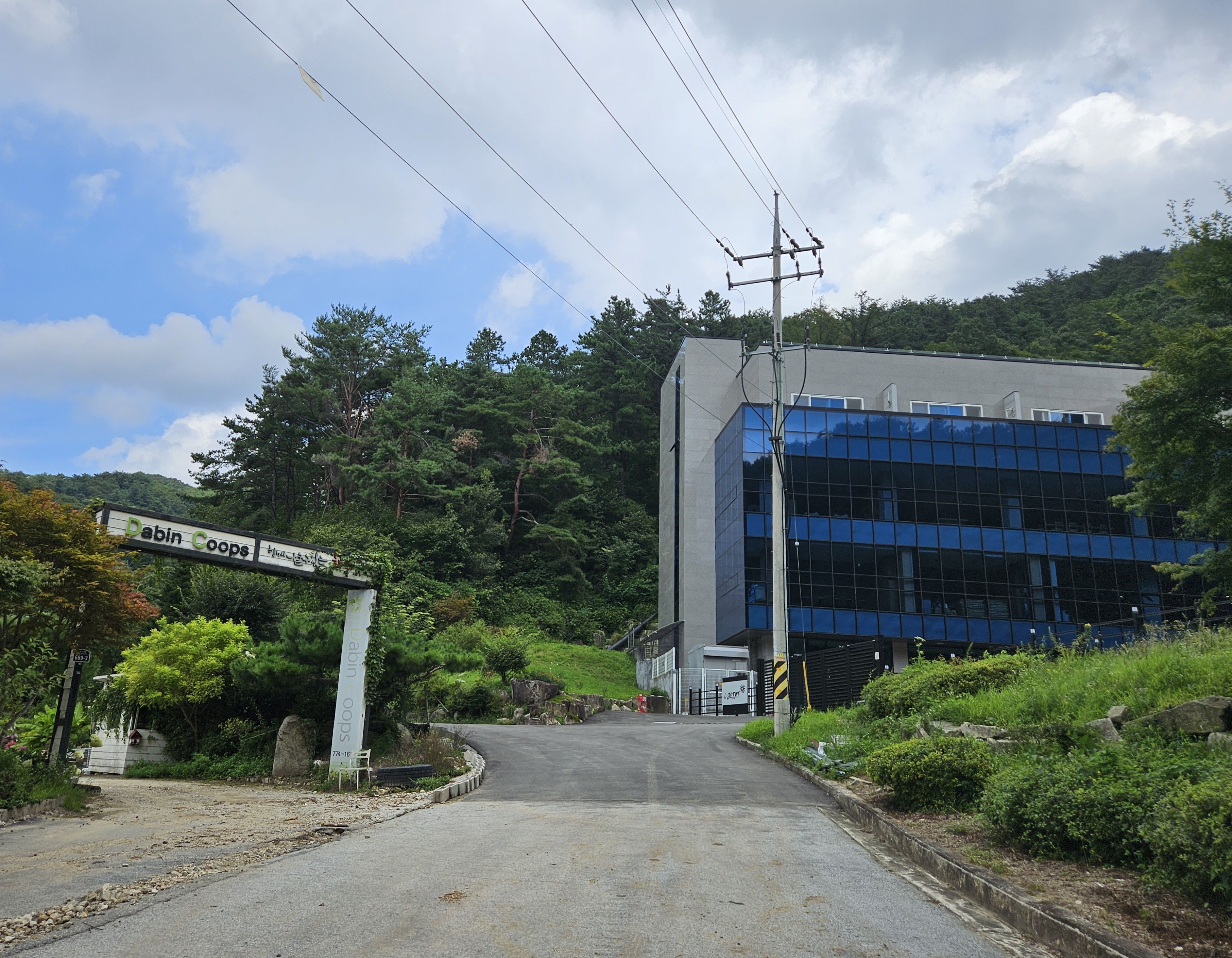 철조망 울타리 아래로 보이는 가축사육장 (때문에 여기까지 향긋한? 냄새가 솔솔?)
