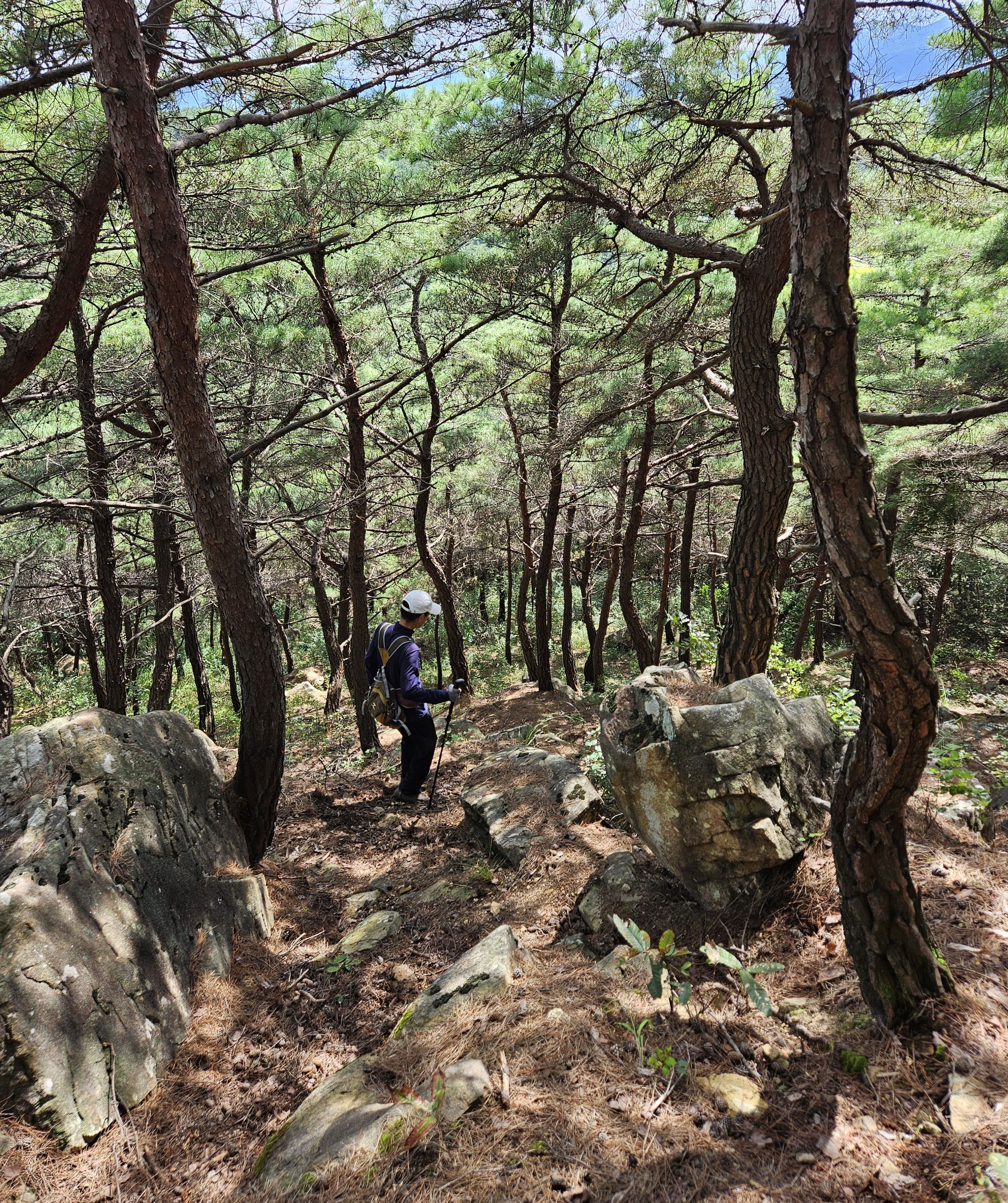 멋진 조망에 도취 한참을 쉬고 꼴찌로 나머지 산 진행으로 (후미라는) 압박감에 등로 좋지않은 잡목길 헤치면서 밟고.. 열심히 가고 있는데 앗!! 오늘 첨 오신분 알바길 같다면서 전화 하셨기에 자초지정 들어보니 3봉에서 조금 오다 오른쪽으로 팍 꺽어야 하는 등로 지나치고 직진으로 가셨던 같더라구요 하필 그 구간에 잡목이 많아 등로가 아예 보이지도 않은곳 (지도앱 아무것도 없으시다고 함) 인데 첨엔 너무 난감 하더라구요 설명으로 찾을길이 아님을 너무나 잘 알고 있었기에....몇번 전화통화로 설명 해 드리고 무작정 기다려보기로... 한참 후 용하게도 잘 찾아 오셨더라구요 정말 반가웠습니다. (본인은 얼마나 당황 하셨을까? 싶었구요) 현시점 총거리 중 약 절반을 타고 절반이 남은 시점이라 만남 이후는 더 빨리 진행하게 되다 보니 많이 힘들어 하시는것 같았습니다.