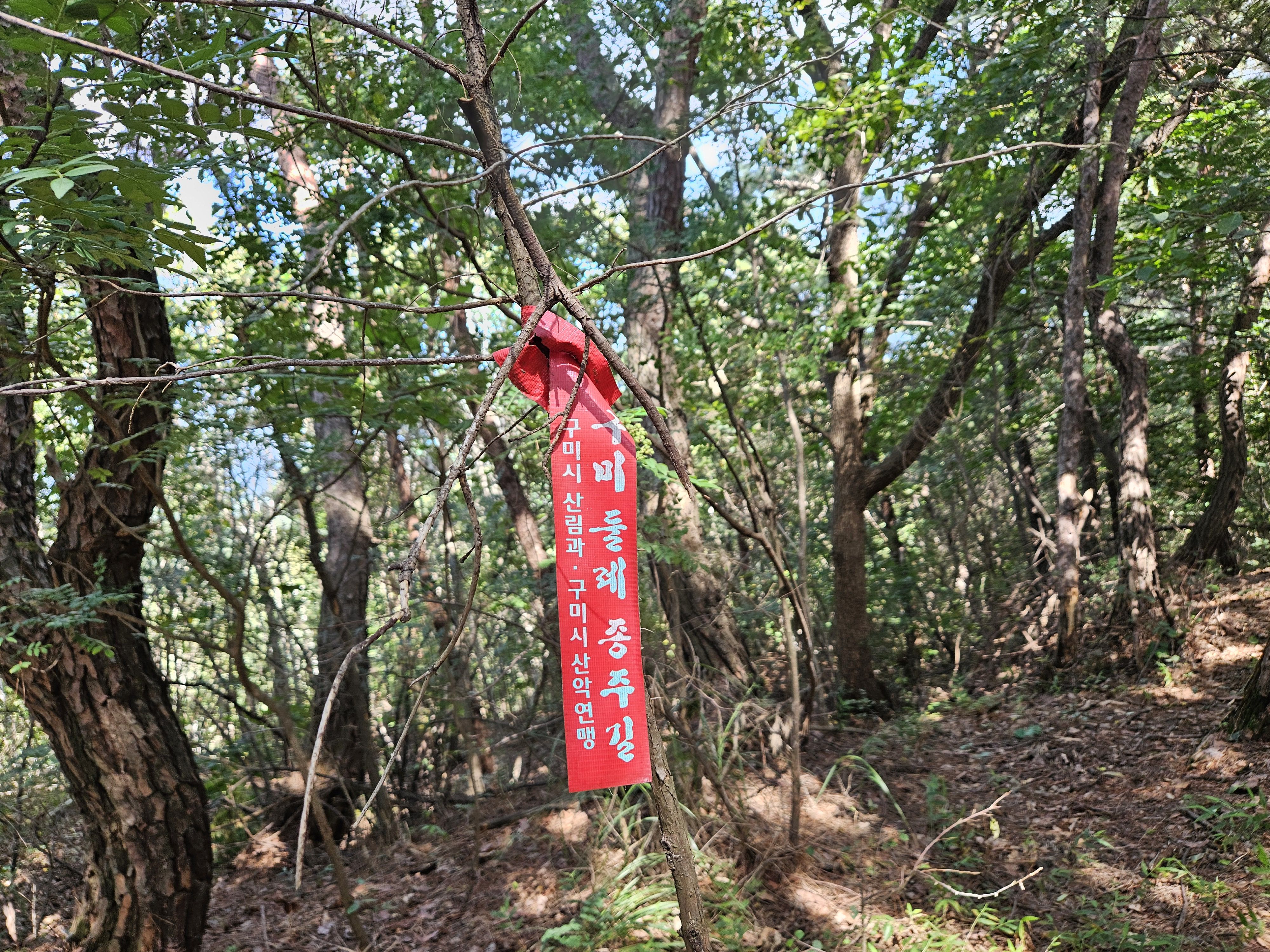 현재 등로는 (구미 둘레 종주길) 이지만 잡목으로 등로가 잘 보이지 않기 때문에 간간히 보이는 빨간 표지기를 따라가면 됩니다.