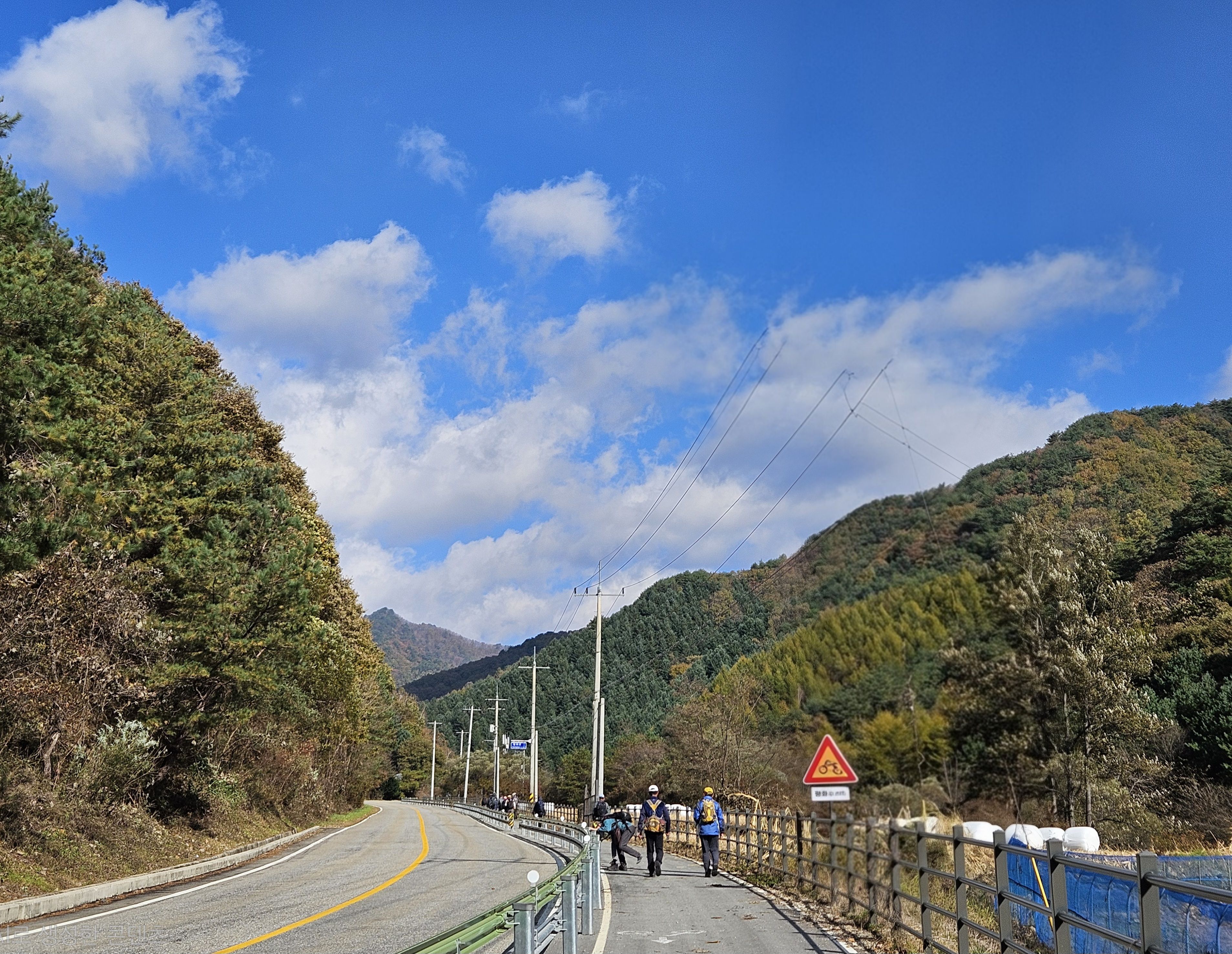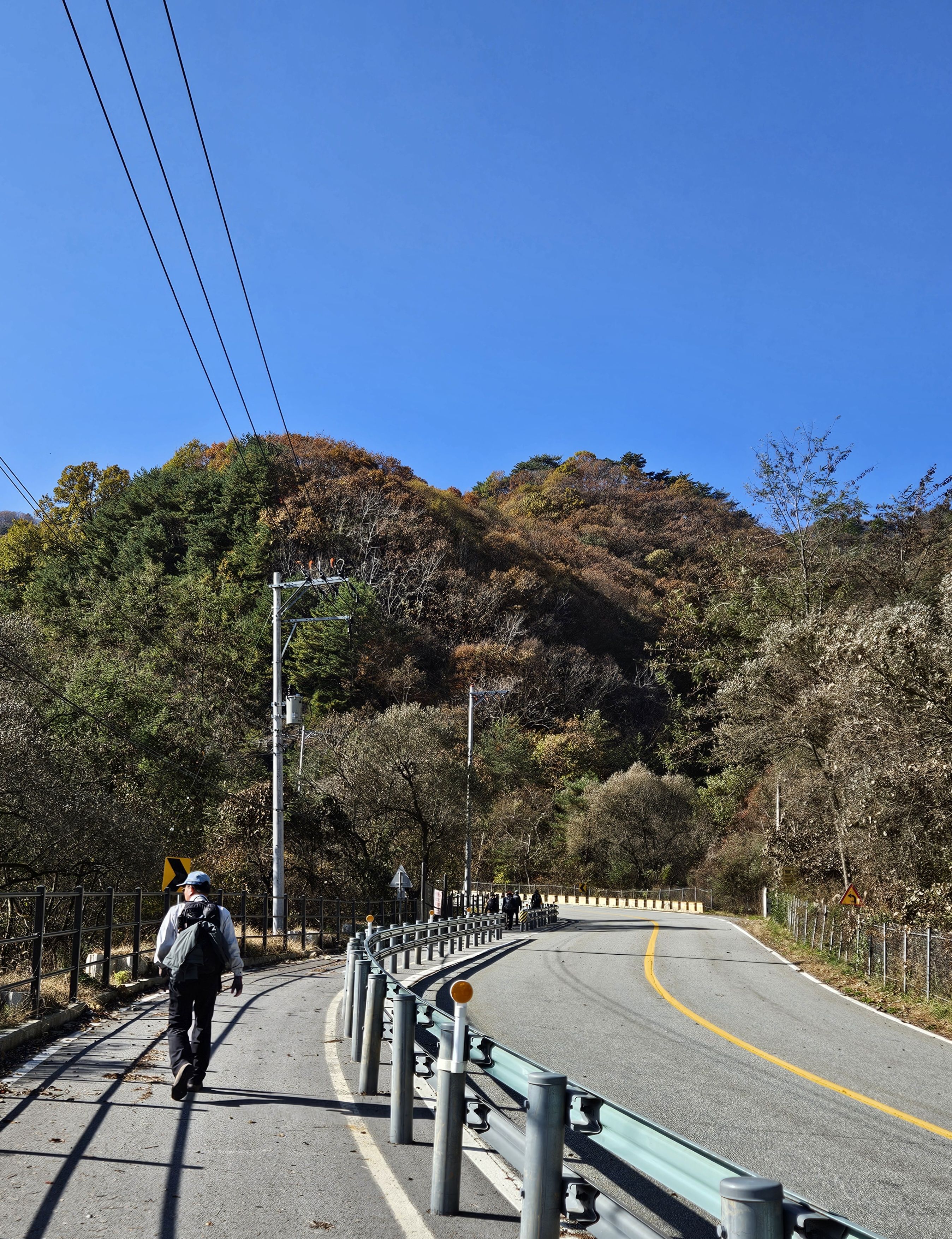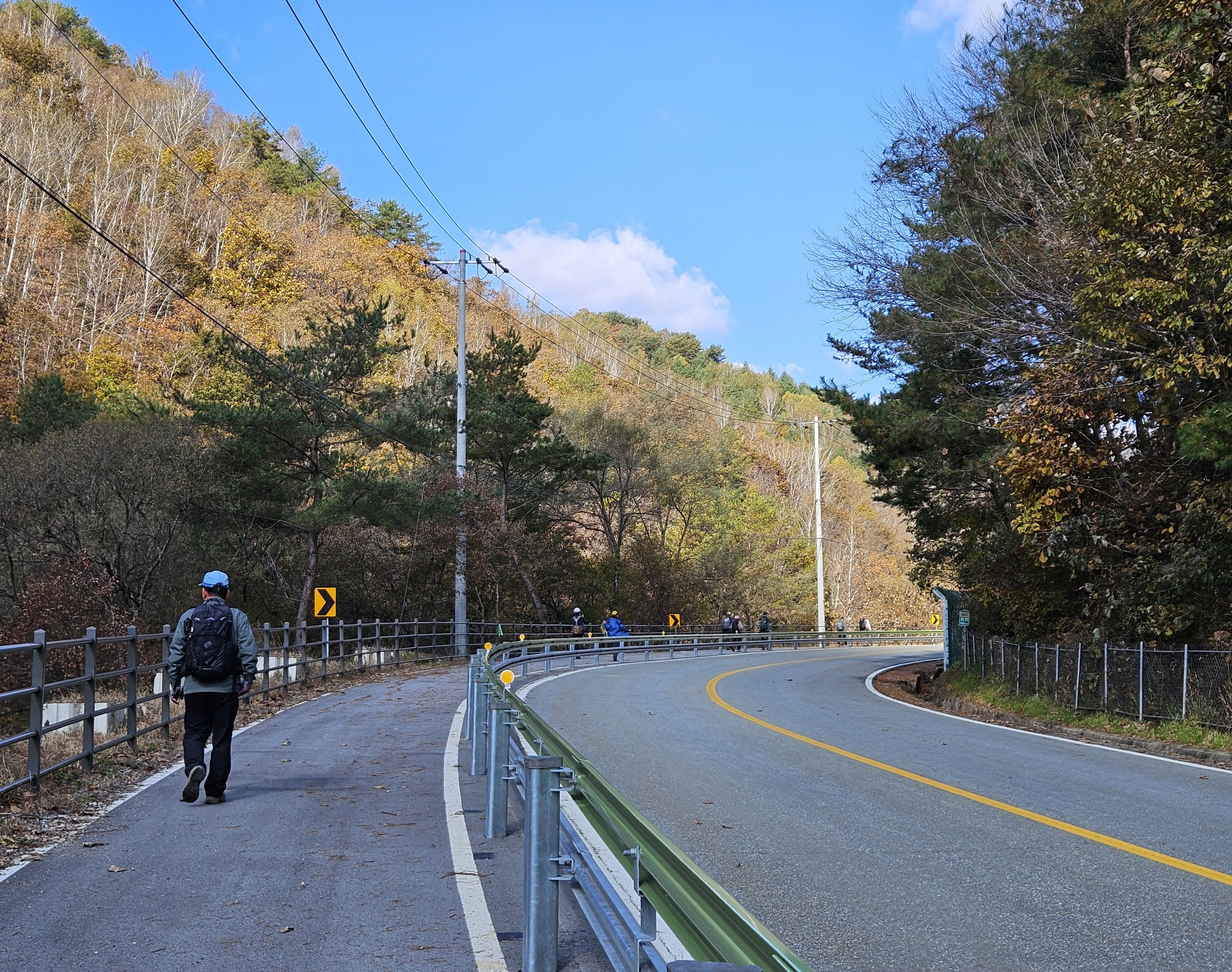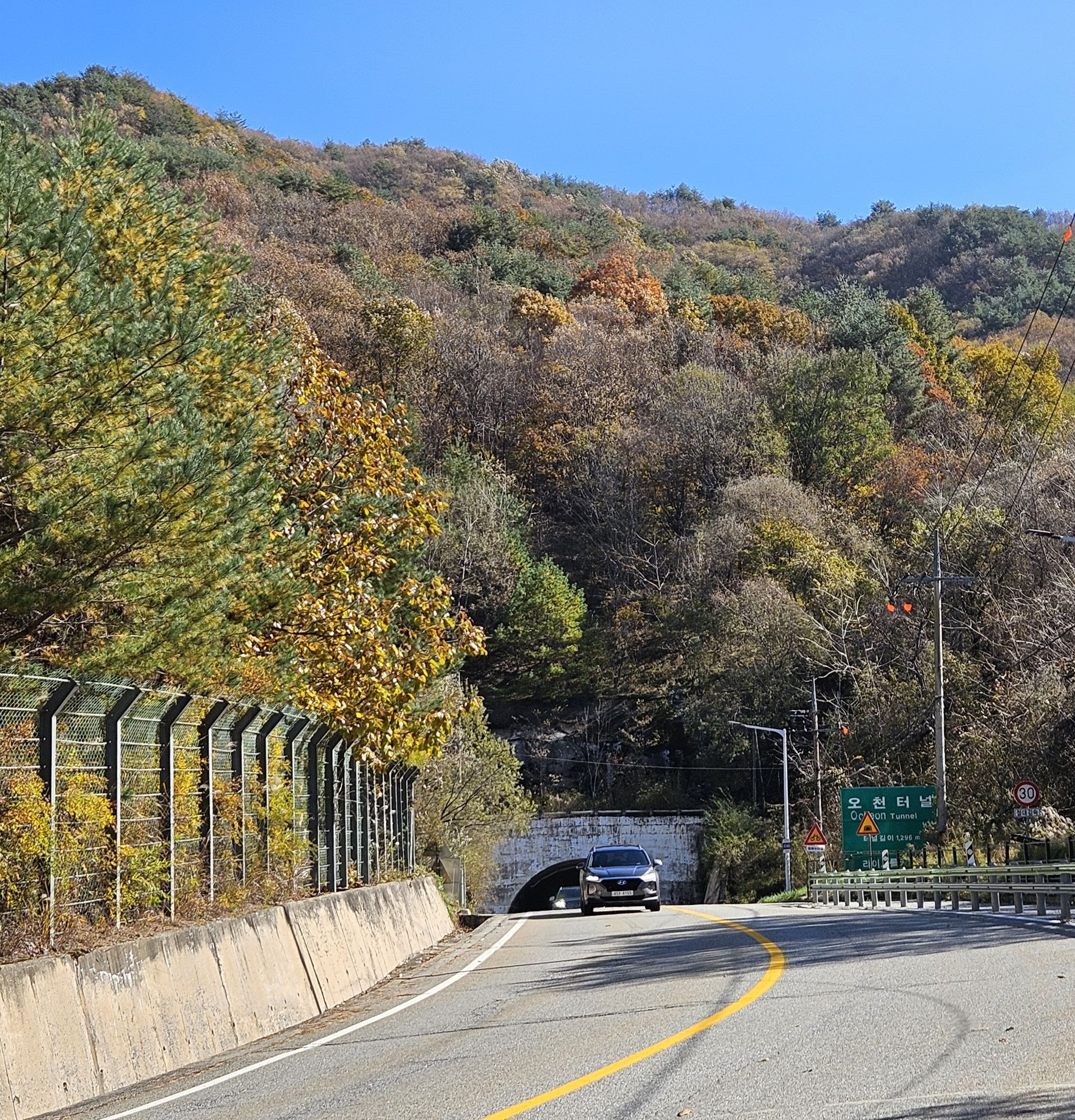 출발부터 종점까지 아스팔트 포장도로 걸었지만 그다지 지루함 느끼지 못하고 산행 종점으로...중간에 오천터널 내부로 걸을땐 위험 하지 않을까? 살짝 걱정이 되었지만 전혀 걱정하지 않아도 괜찮습니다 (양방향 차량 왕래가 거의 없고 내부 인도 도 넓어 무사 통과 가능한 길 이었답니다.) 터널 지나 내려오는길 가을 풍경을 한층 더 해 준 울긋불긋 단풍과 파아늘 하늘. 모두가 만족했던 가을 기분좋은 트레킹 이었습니다. 그런데 서울상경 길은 고속도로 사정 별로 좋지 않아 단풍철 도로정체... 오전 과 오후 모두 정체정체 반복 후 목적지 도착 하게되었습니다.