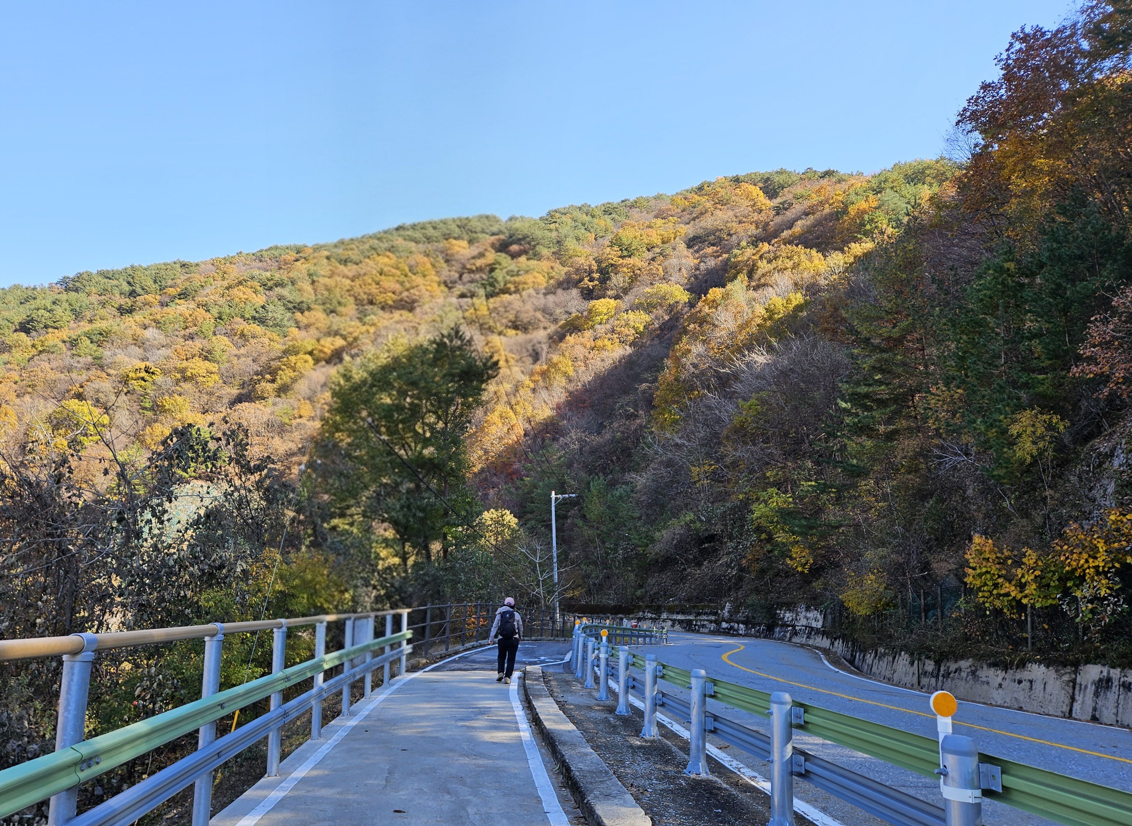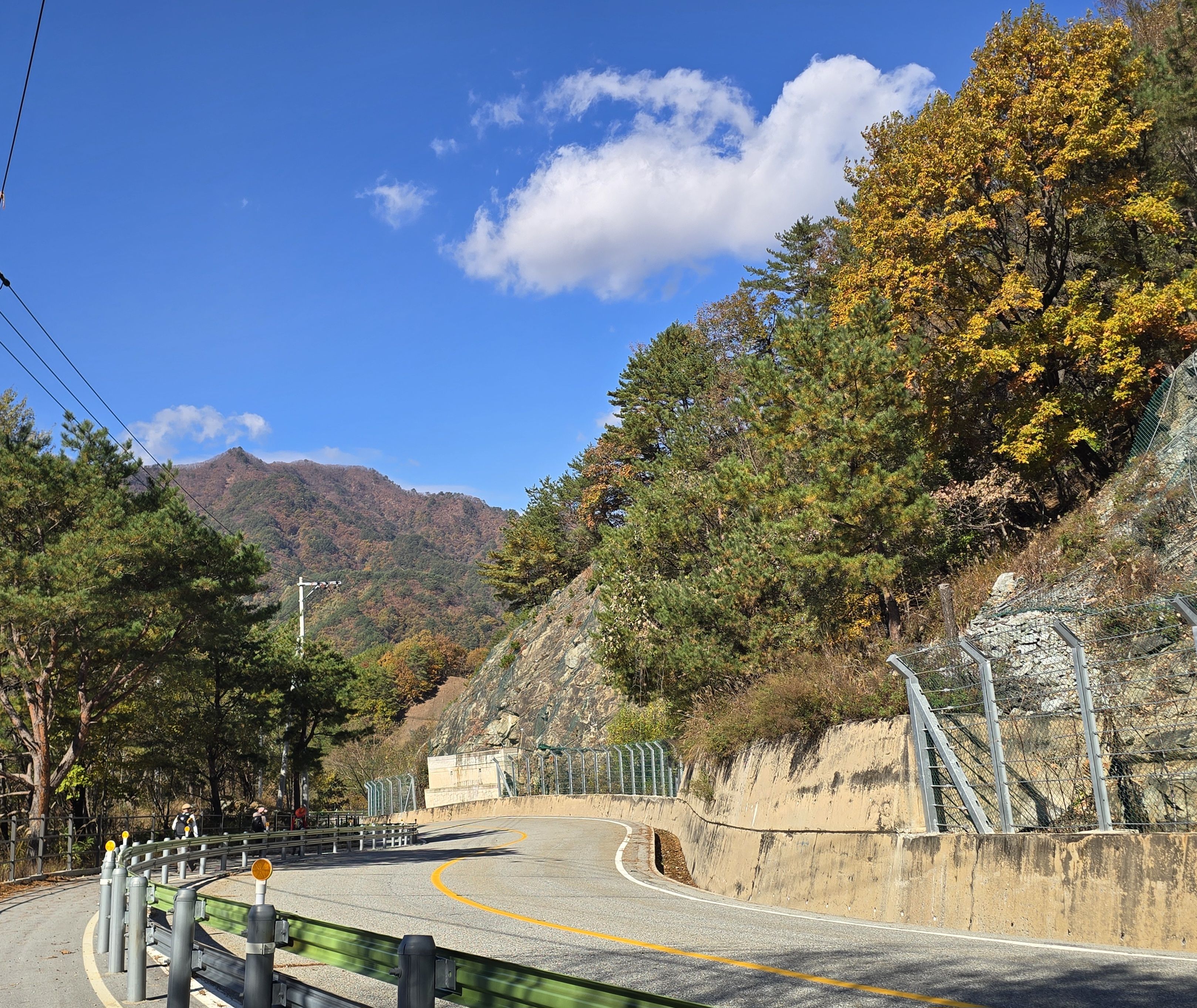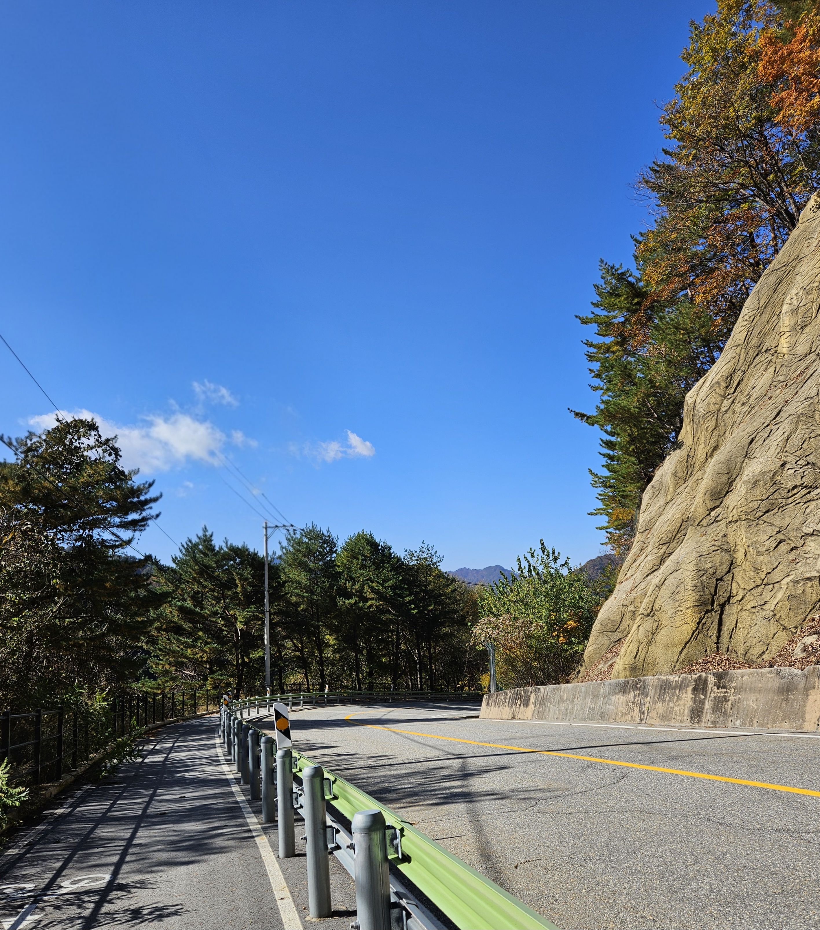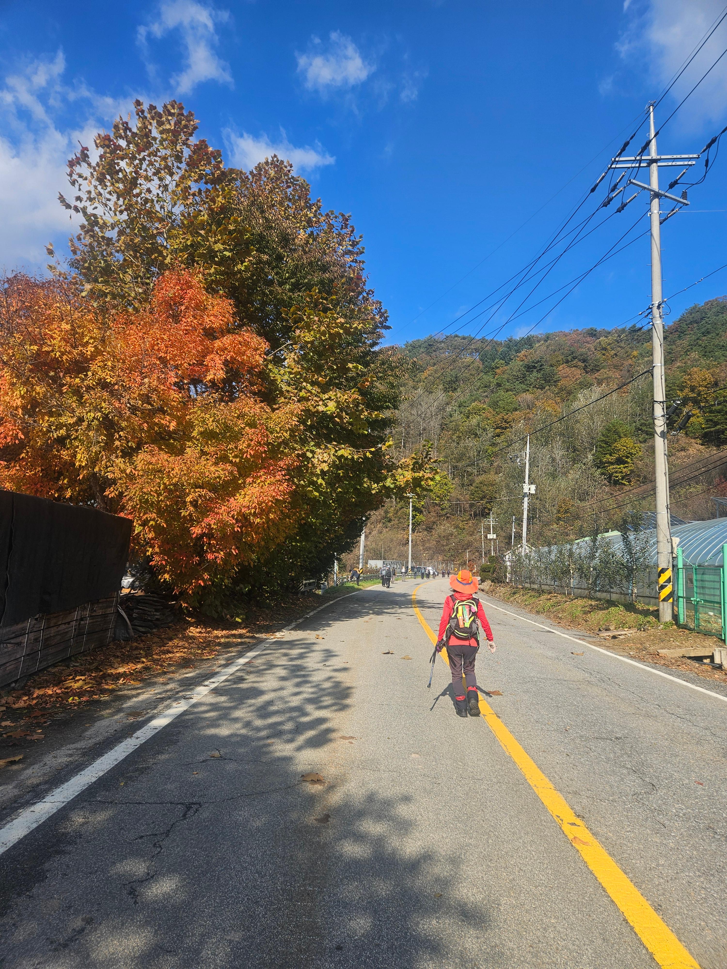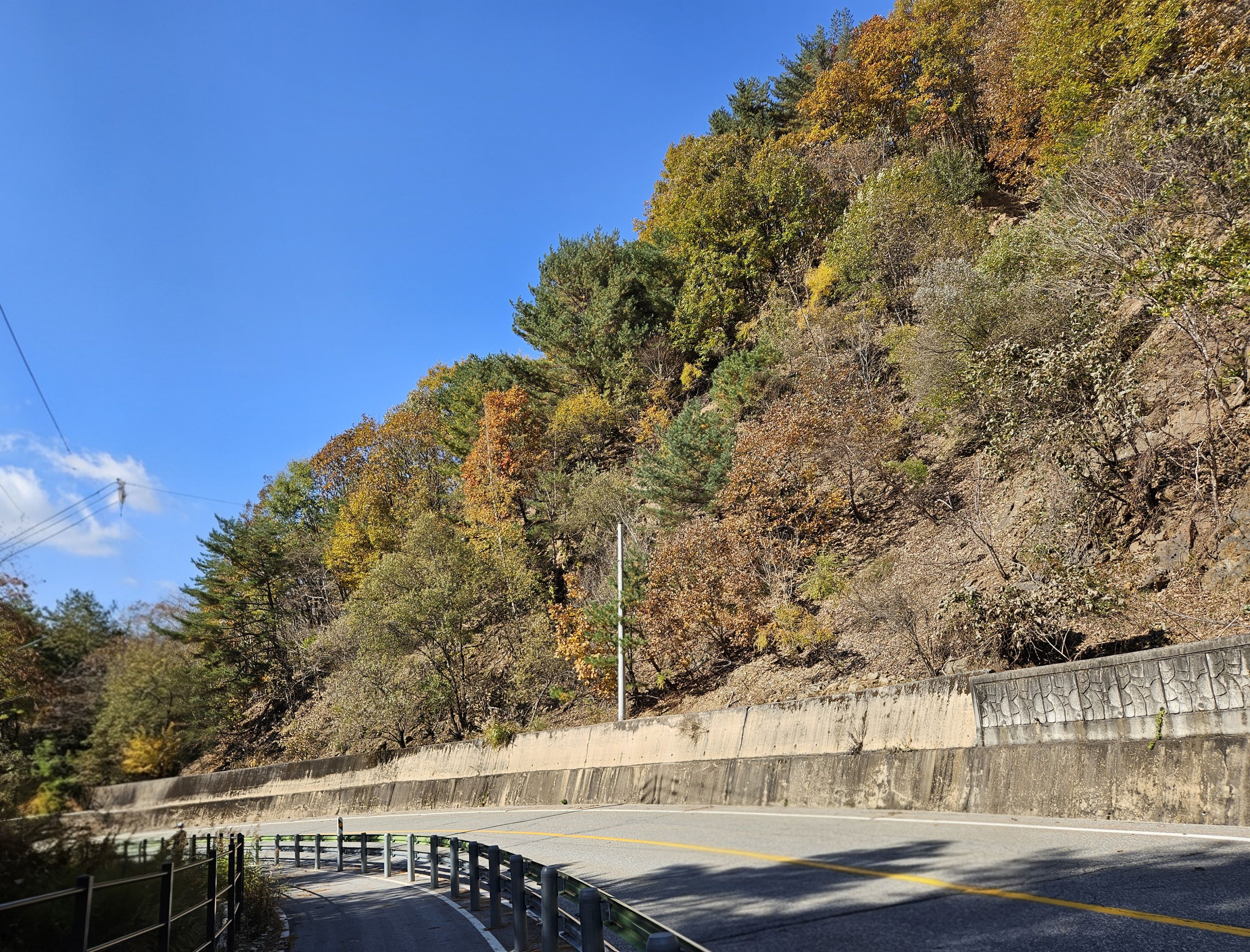 출발부터 종점까지 아스팔트 포장도로 걸었지만 그다지 지루함 느끼지 못하고 산행 종점으로...중간에 오천터널 내부로 걸을땐 위험 하지 않을까? 살짝 걱정이 되었지만 전혀 걱정하지 않아도 괜찮습니다 (양방향 차량 왕래가 거의 없고 내부 인도 도 넓어 무사 통과 가능한 길 이었답니다.) 터널 지나 내려오는길 가을 풍경을 한층 더 해 준 울긋불긋 단풍과 파아늘 하늘. 모두가 만족했던 가을 기분좋은 트레킹 이었습니다. 그런데 서울상경 길은 고속도로 사정 별로 좋지 않아 단풍철 도로정체... 오전 과 오후 모두 정체정체 반복 후 목적지 도착 하게되었습니다.