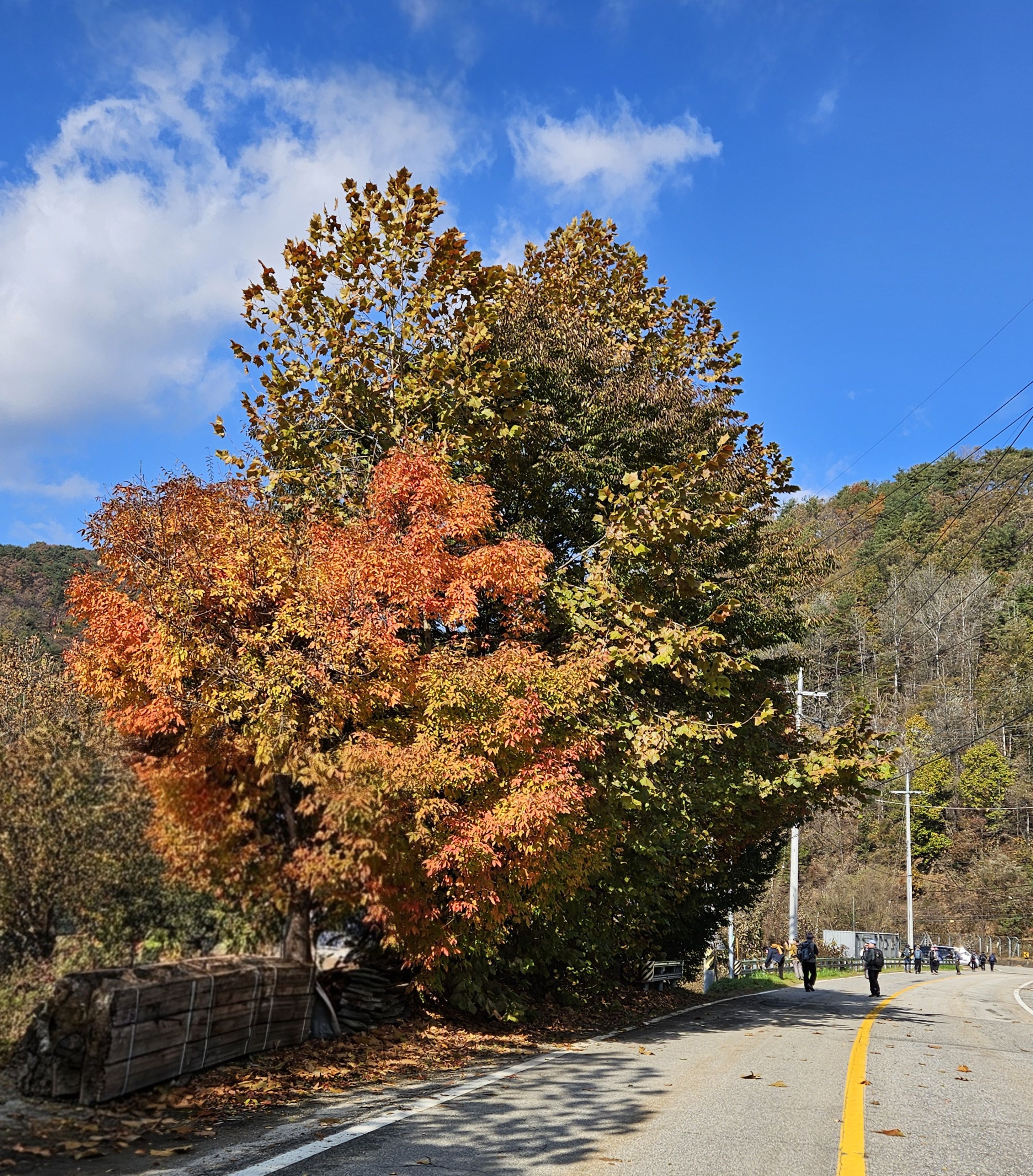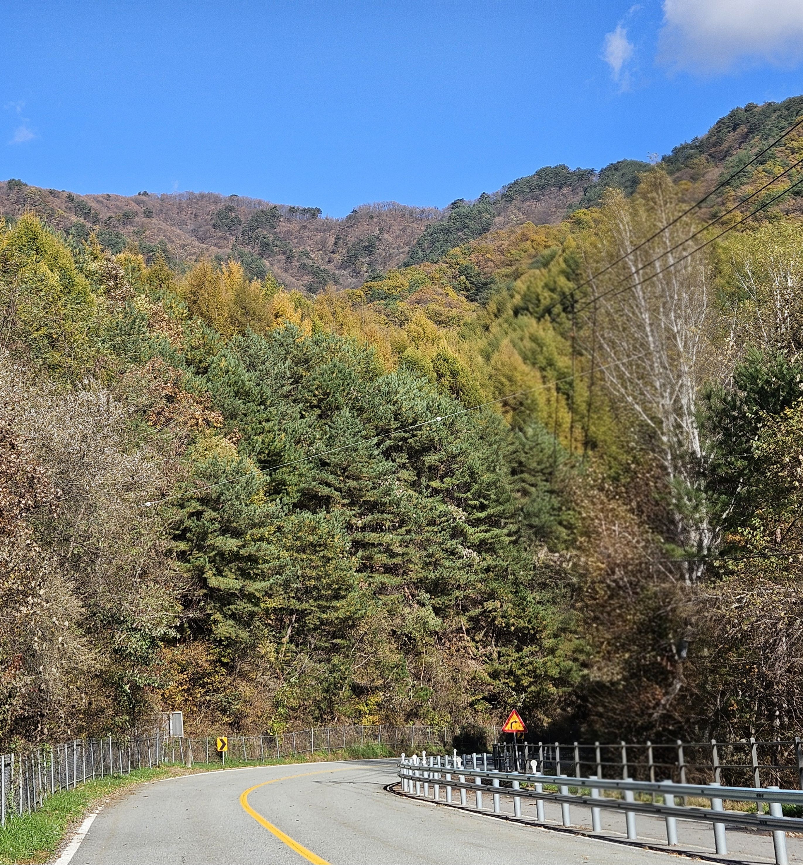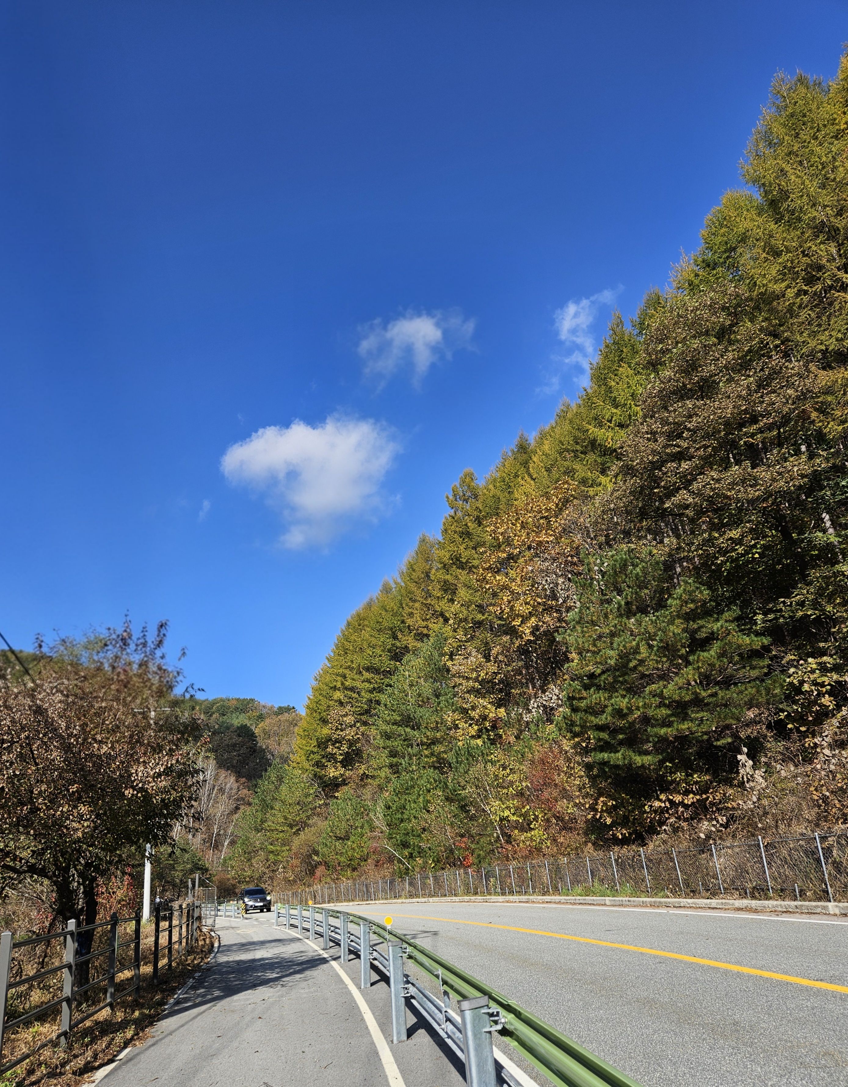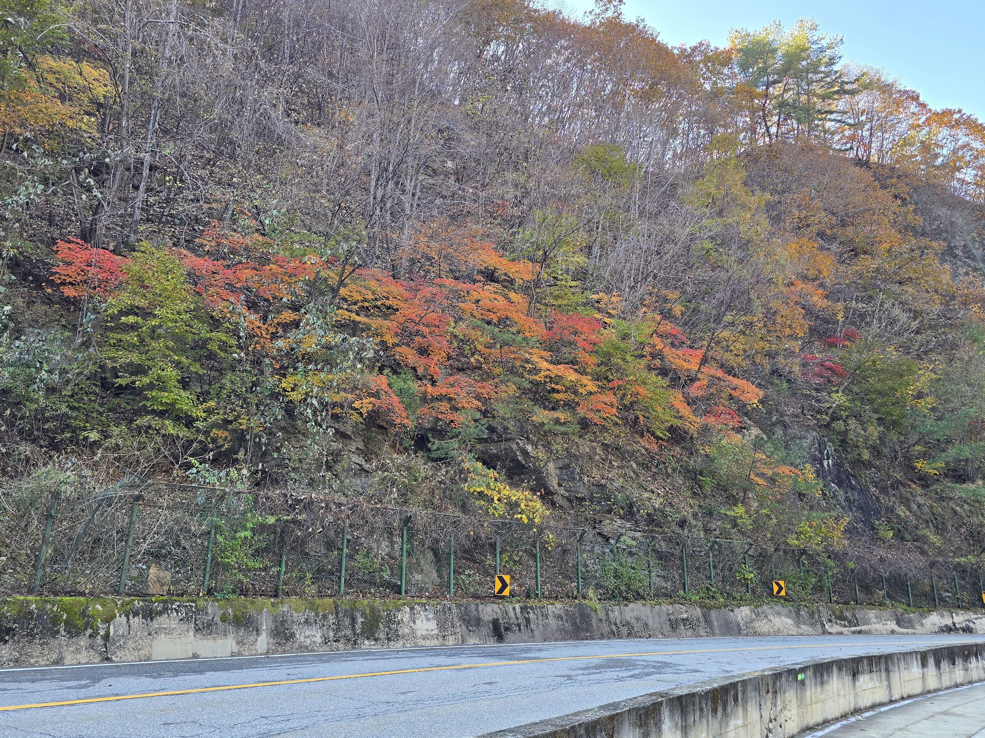 출발부터 종점까지 아스팔트 포장도로 걸었지만 그다지 지루함 느끼지 못하고 산행 종점으로...중간에 오천터널 내부로 걸을땐 위험 하지 않을까? 살짝 걱정이 되었지만 전혀 걱정하지 않아도 괜찮습니다 (양방향 차량 왕래가 거의 없고 내부 인도 도 넓어 무사 통과 가능한 길 이었답니다.) 터널 지나 내려오는길 가을 풍경을 한층 더 해 준 울긋불긋 단풍과 파아늘 하늘. 모두가 만족했던 가을 기분좋은 트레킹 이었습니다. 그런데 서울상경 길은 고속도로 사정 별로 좋지 않아 단풍철 도로정체... 오전 과 오후 모두 정체정체 반복 후 목적지 도착 하게되었습니다.