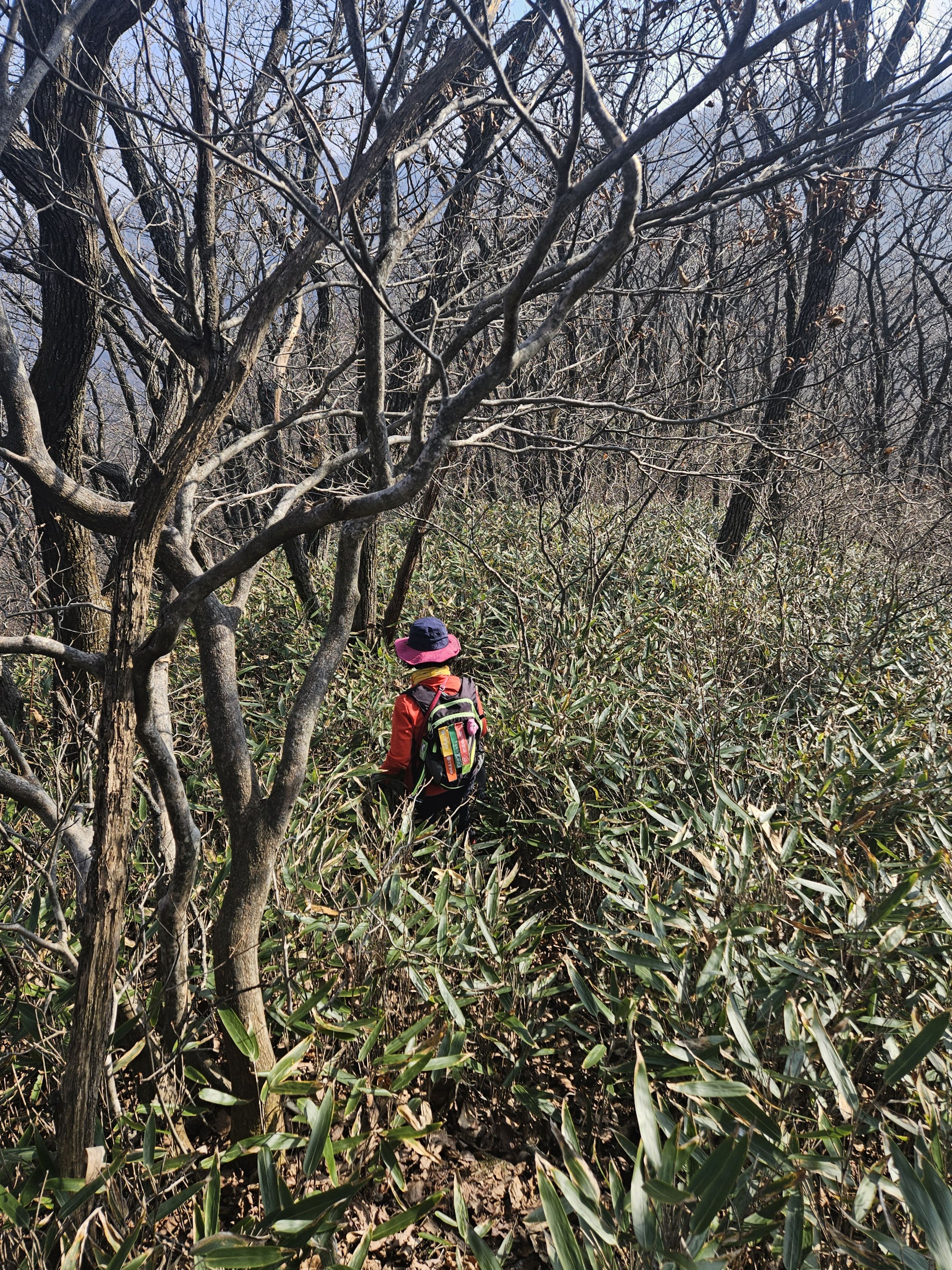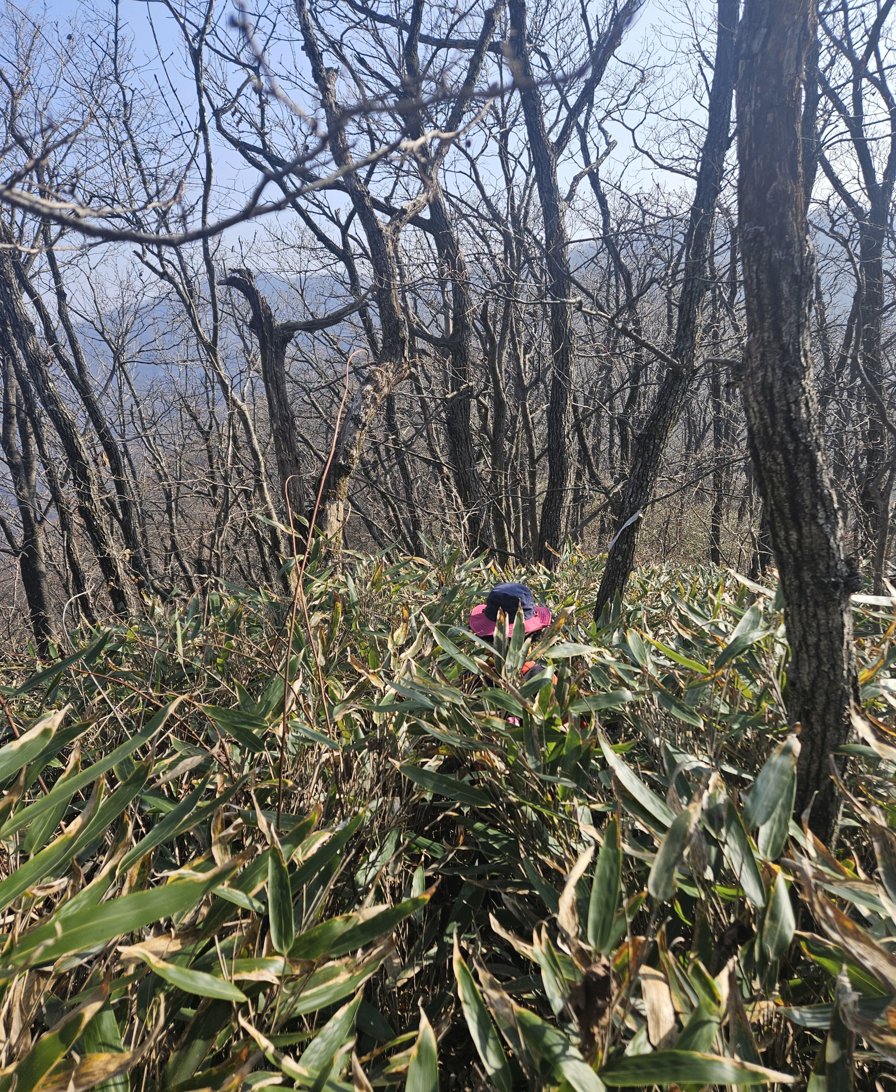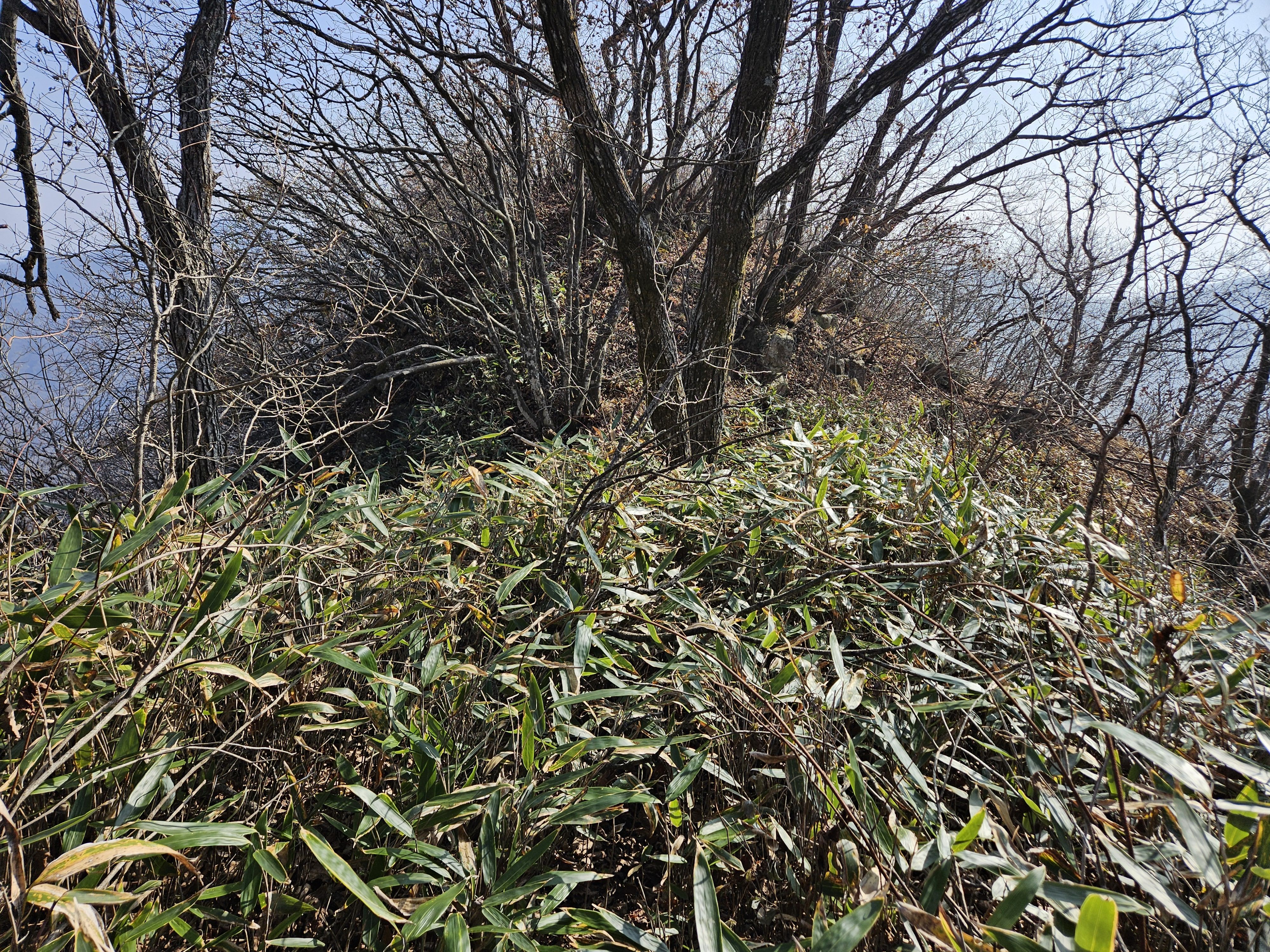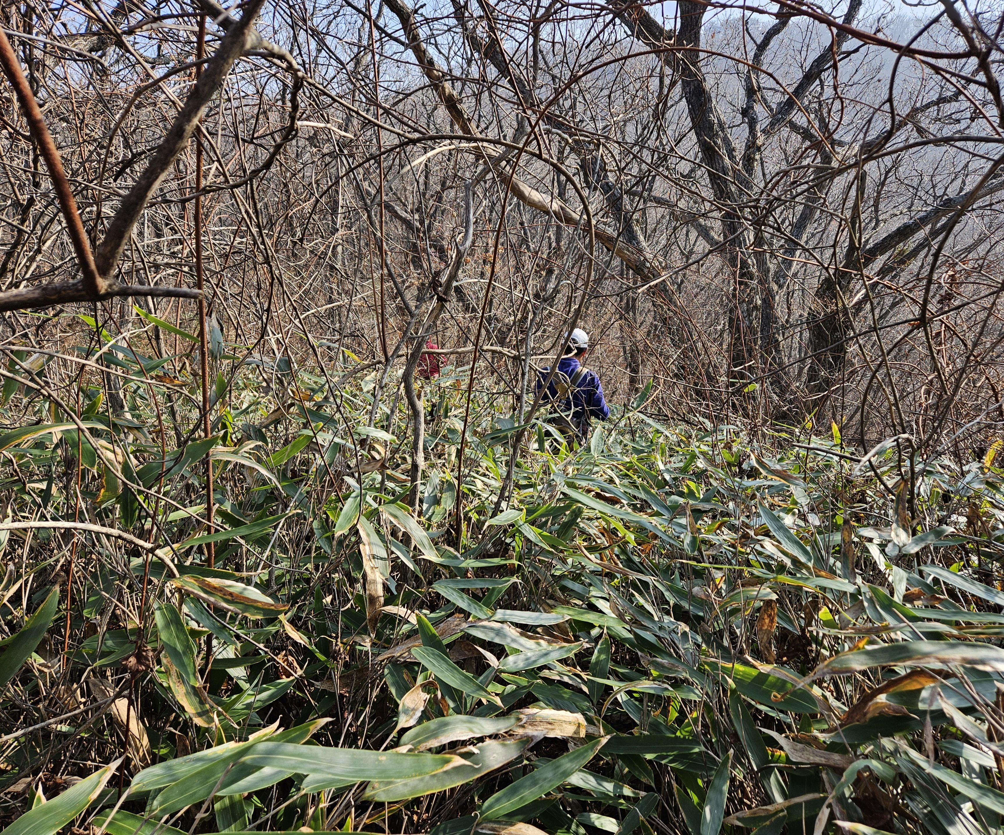 설상가상 산죽군락지 어찌나 많았는지 산죽에 갇혀서 헤어 나오느라 참말로 생고생... 또 하나 더 멱줄기 풍성했던 여름날에나 힘들줄 알았는데 아니올시다 줄기만 남았는데도 온몸을 끌어당기듯 위.아래 사방으로 걸려서 이 또한 헤치고 나오느라 진땀 났습니다.