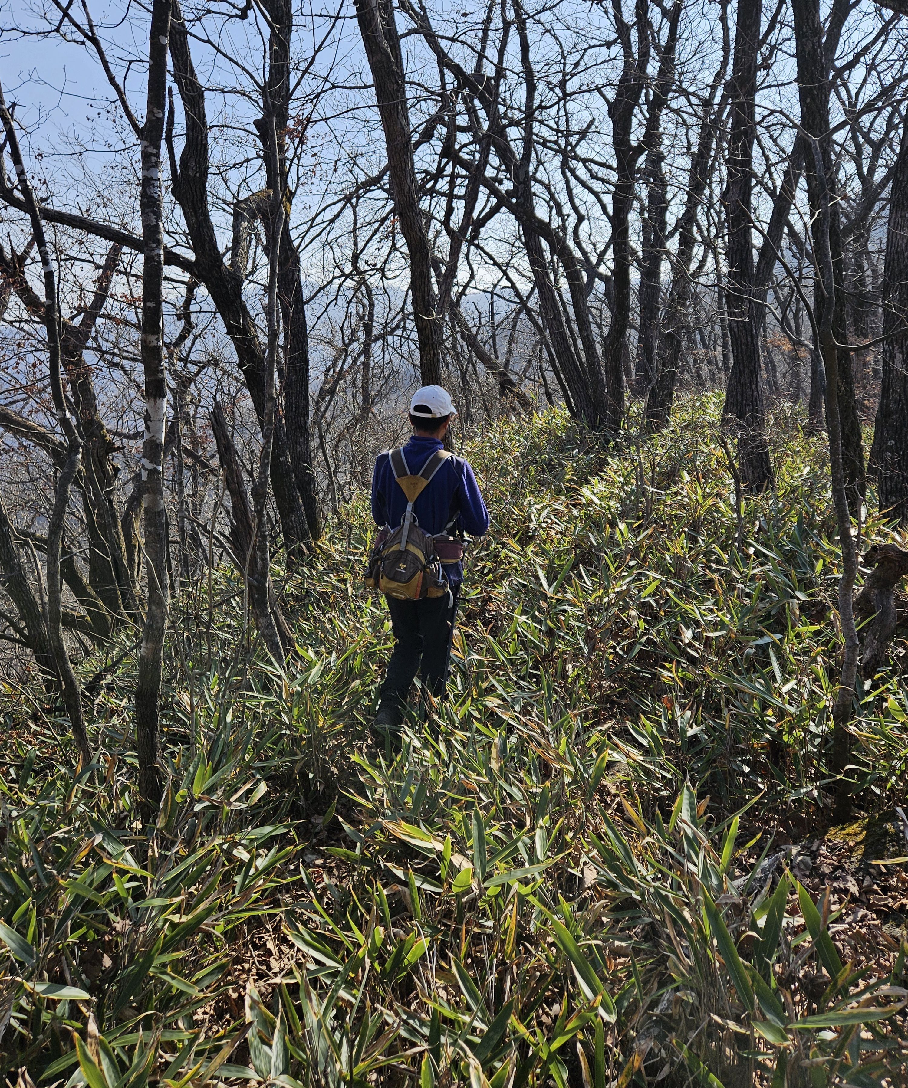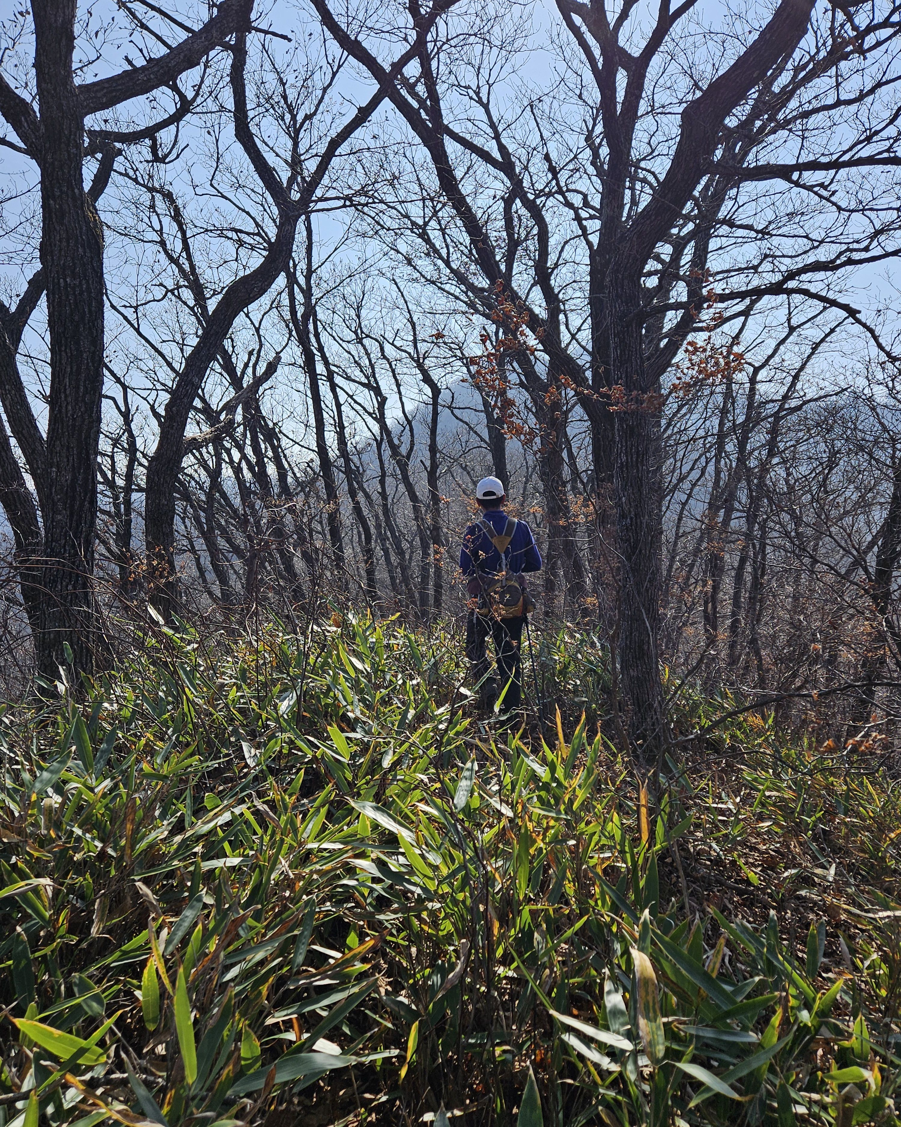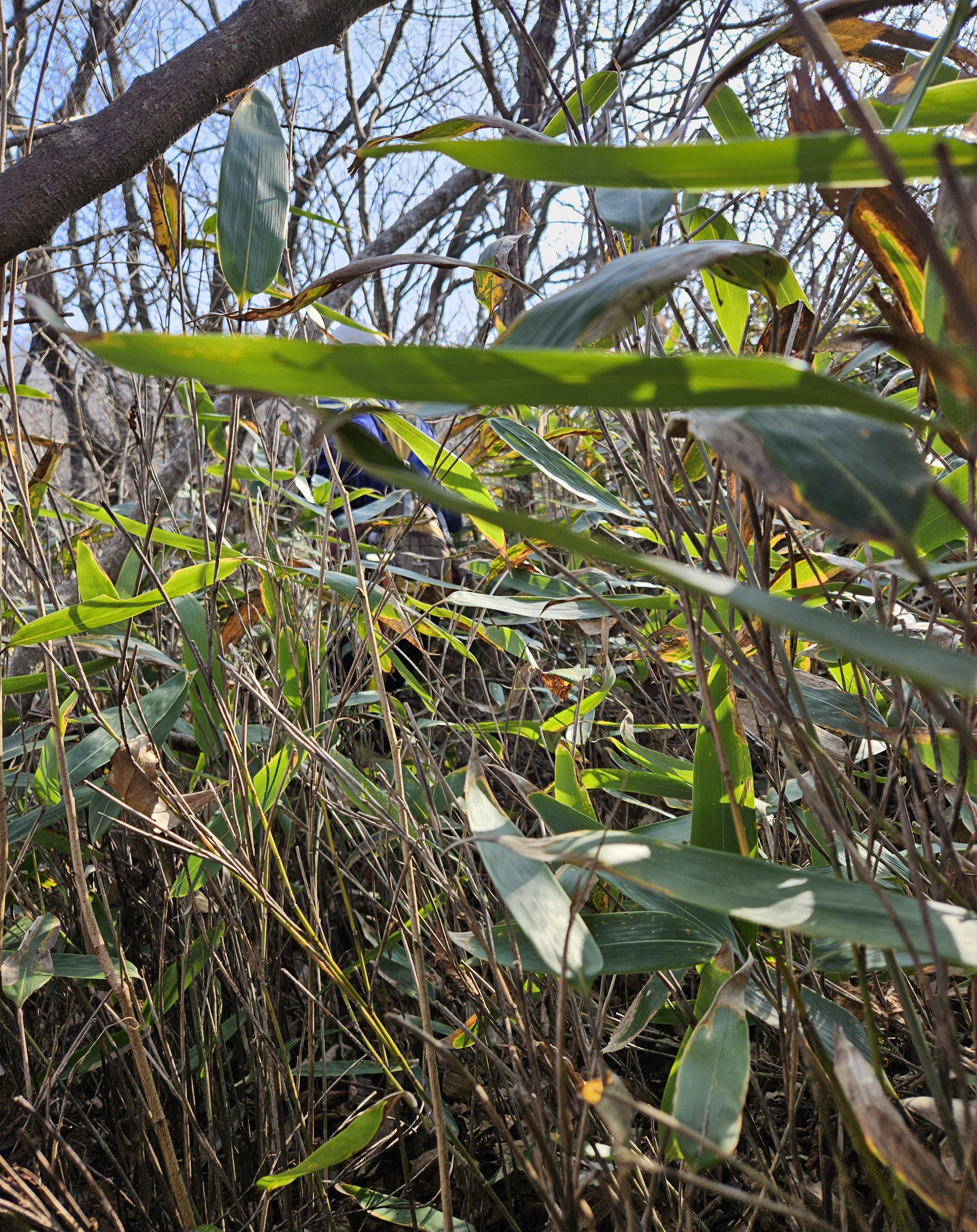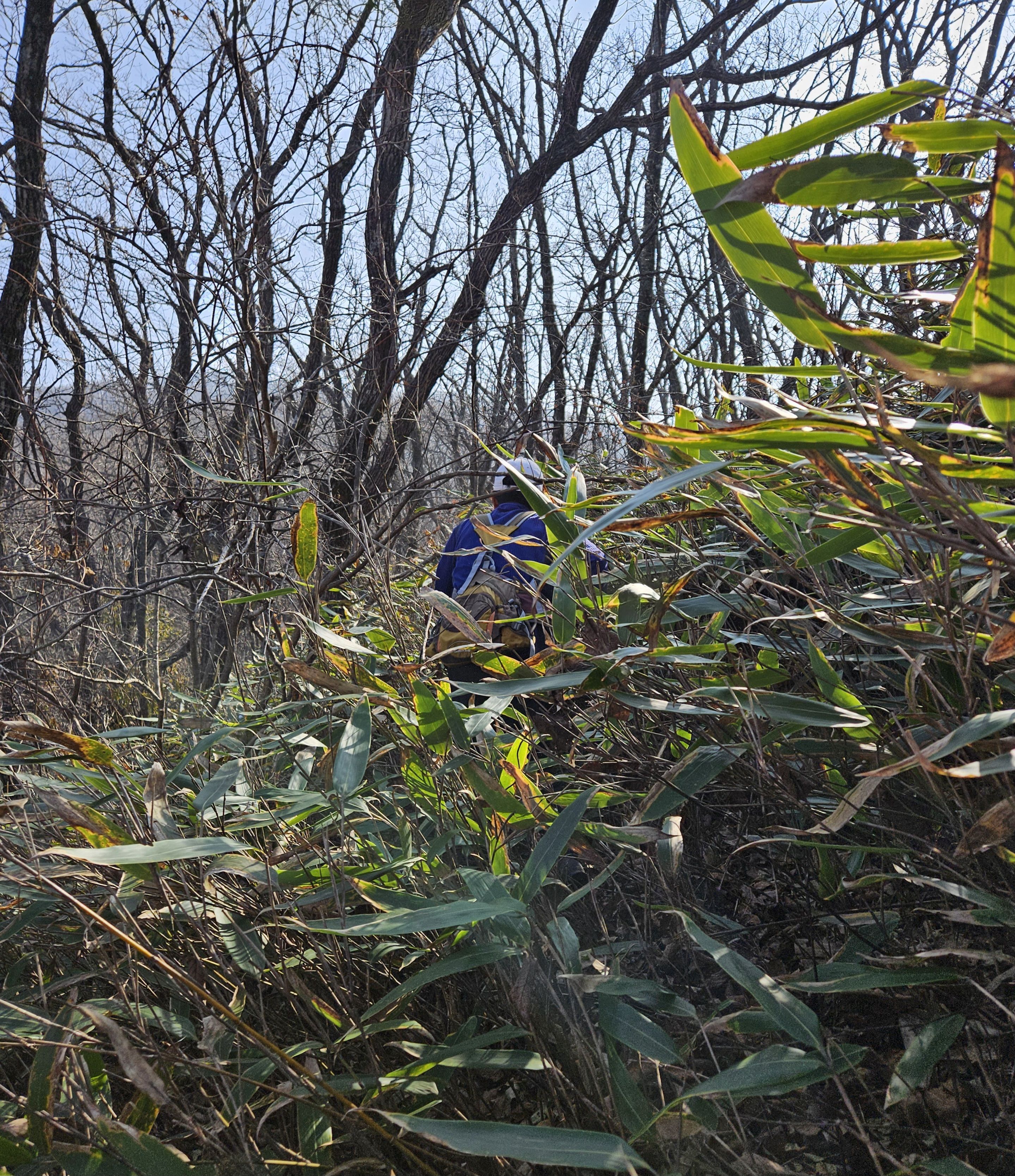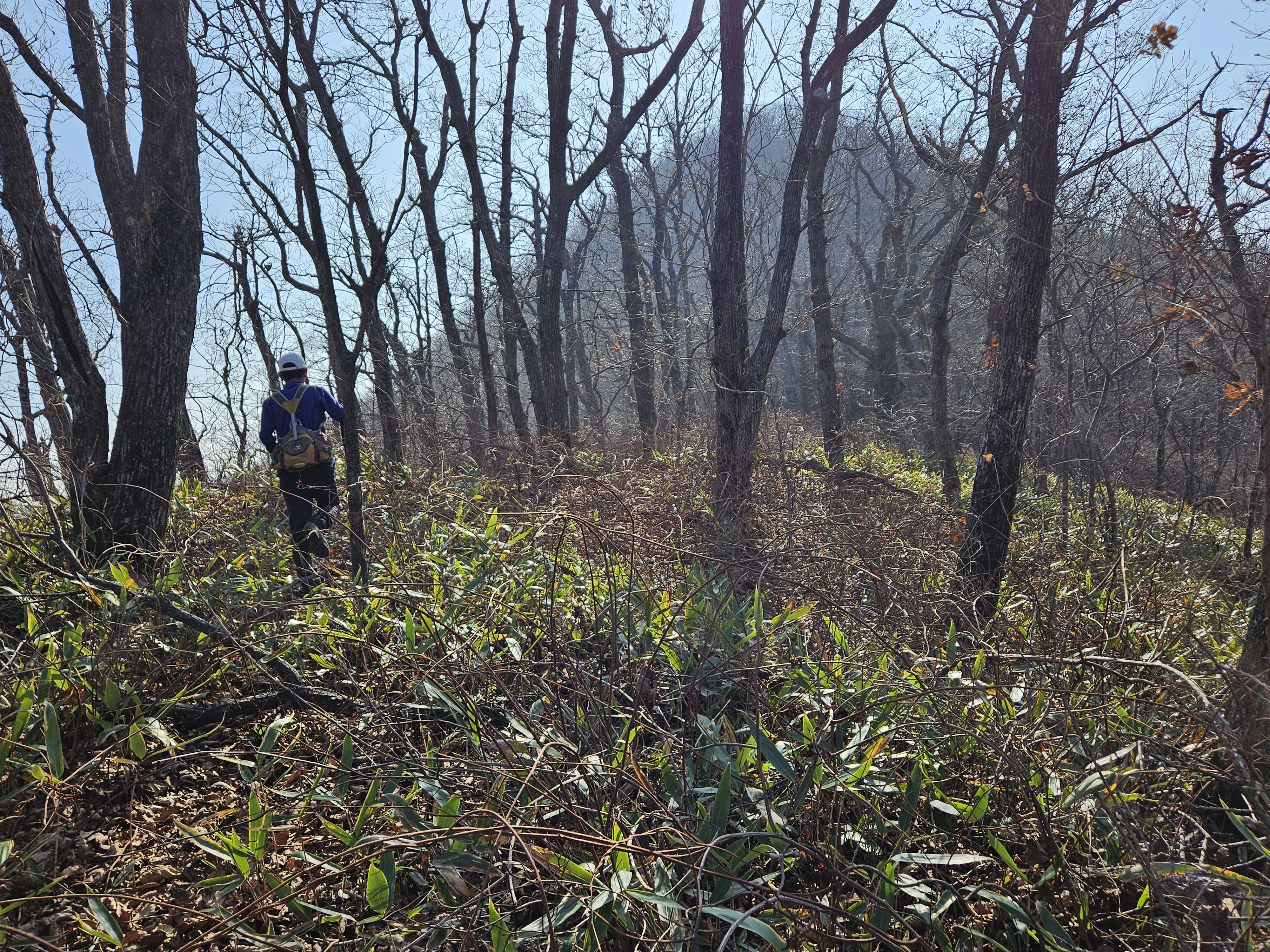 설상가상 산죽군락지 어찌나 많았는지 산죽에 갇혀서 헤어 나오느라 참말로 생고생... 또 하나 더 멱줄기 풍성했던 여름날에나 힘들줄 알았는데 아니올시다 줄기만 남았는데도 온몸을 끌어당기듯 위.아래 사방으로 걸려서 이 또한 헤치고 나오느라 진땀 났습니다.