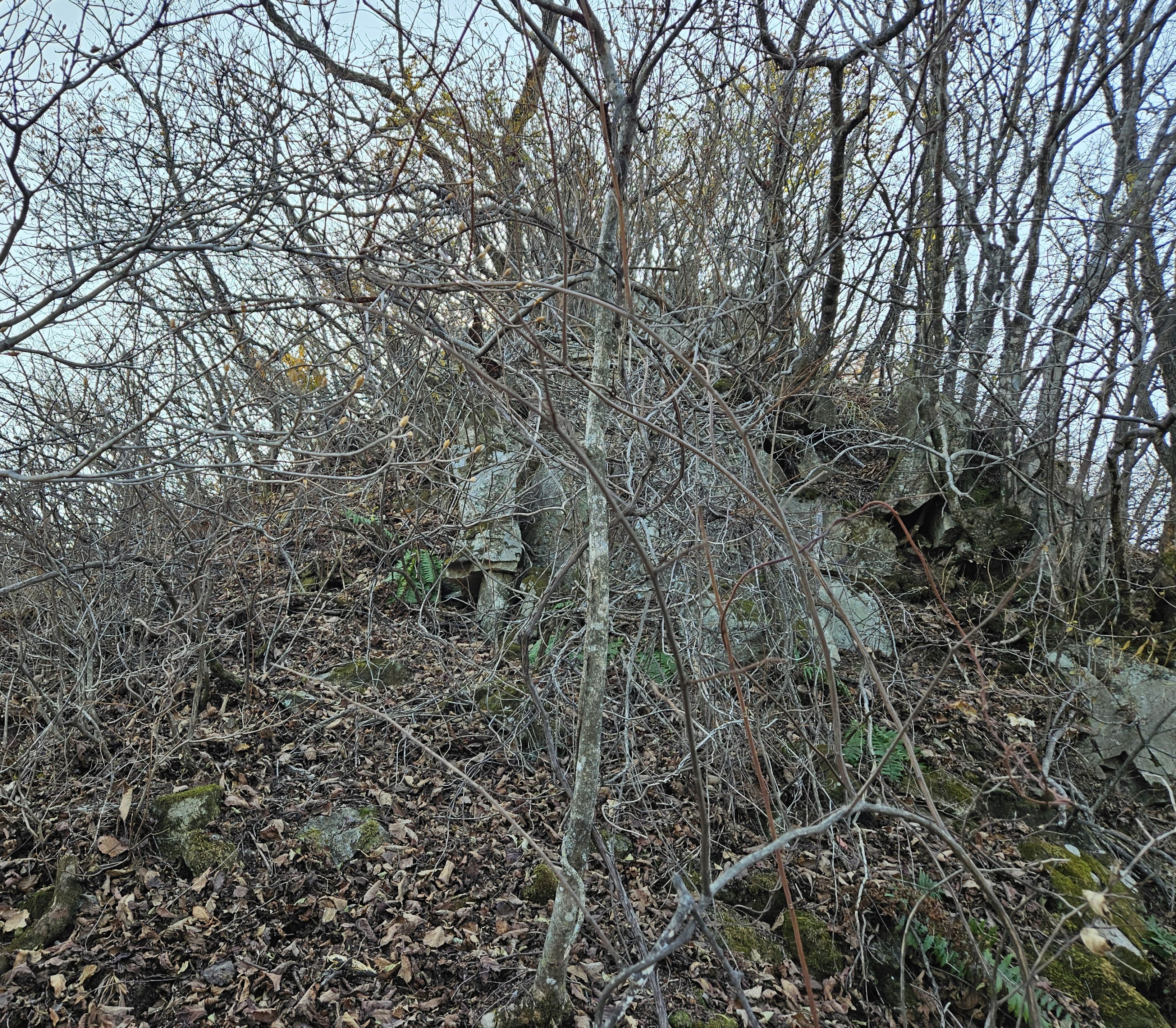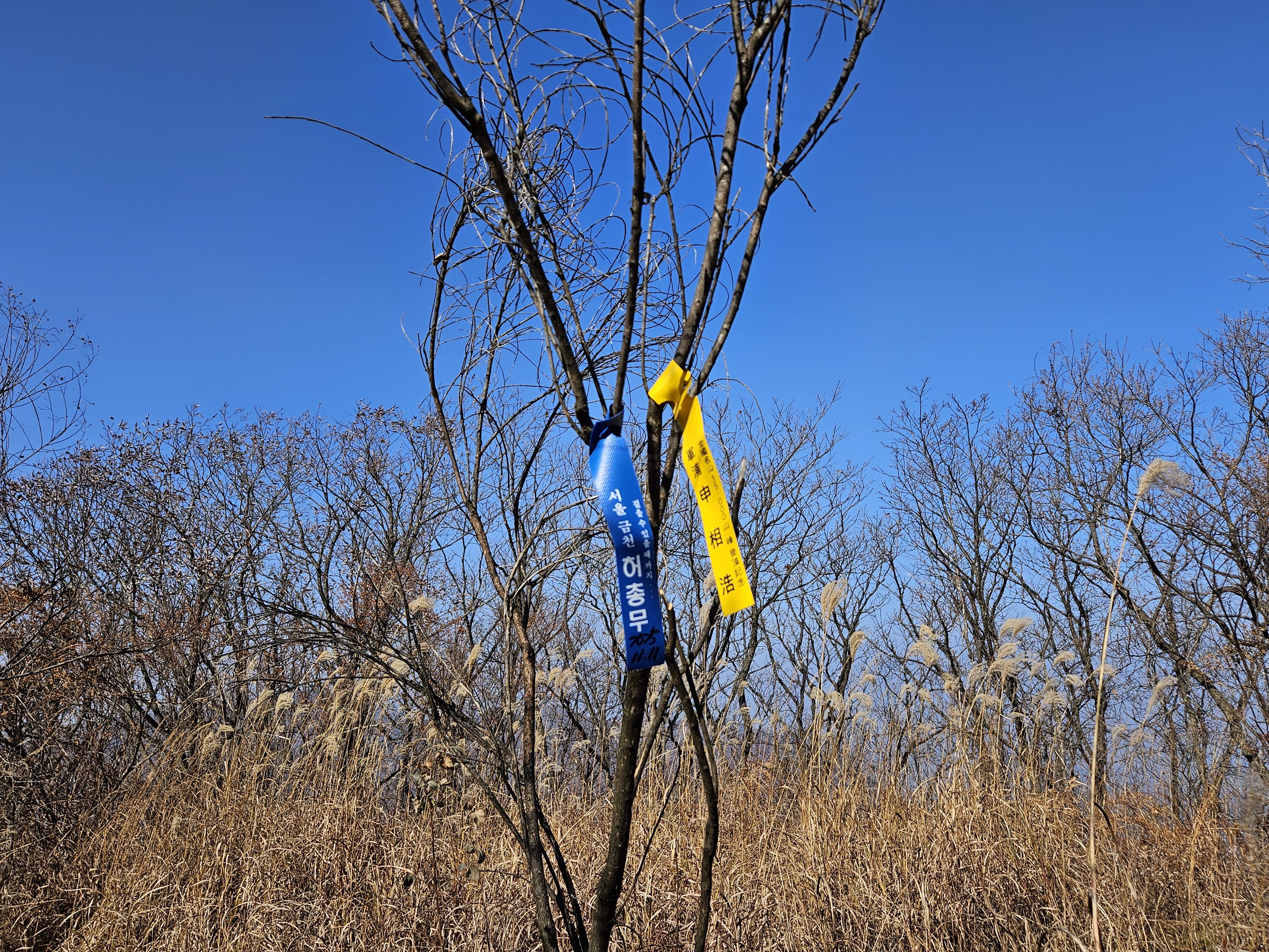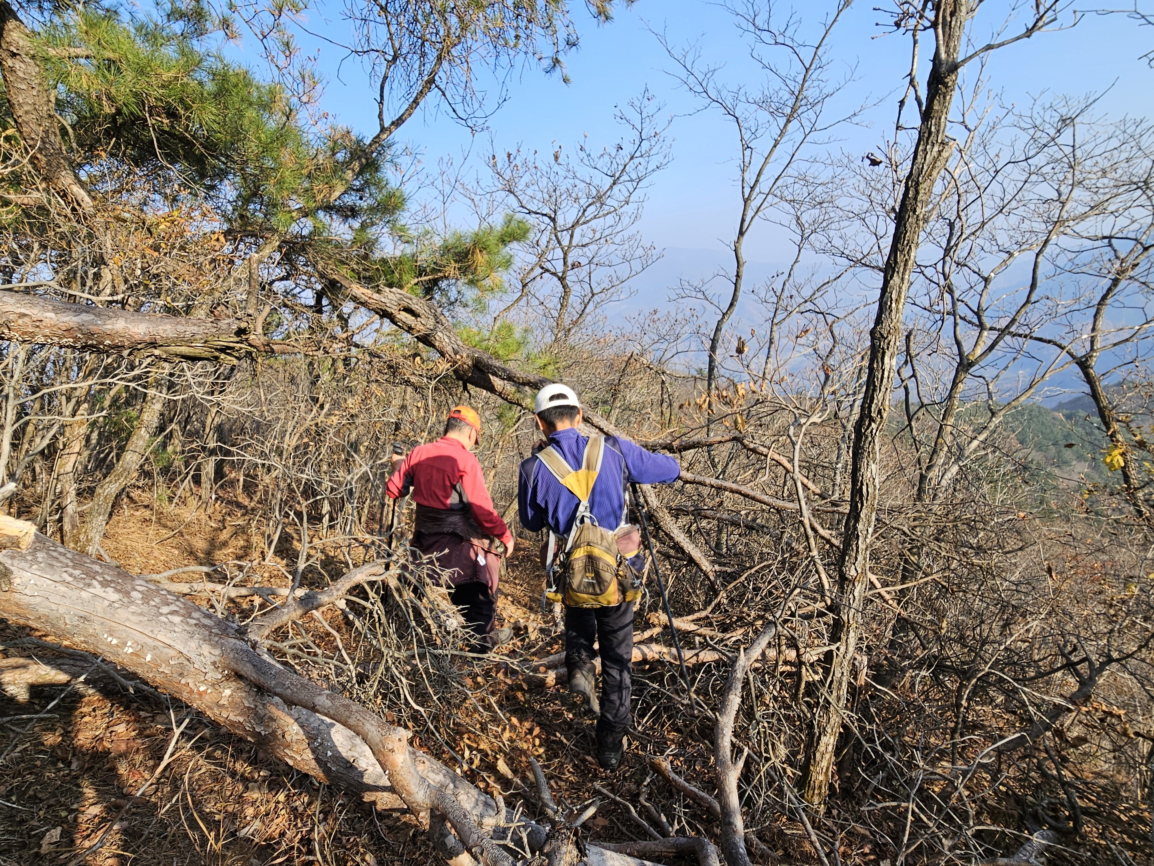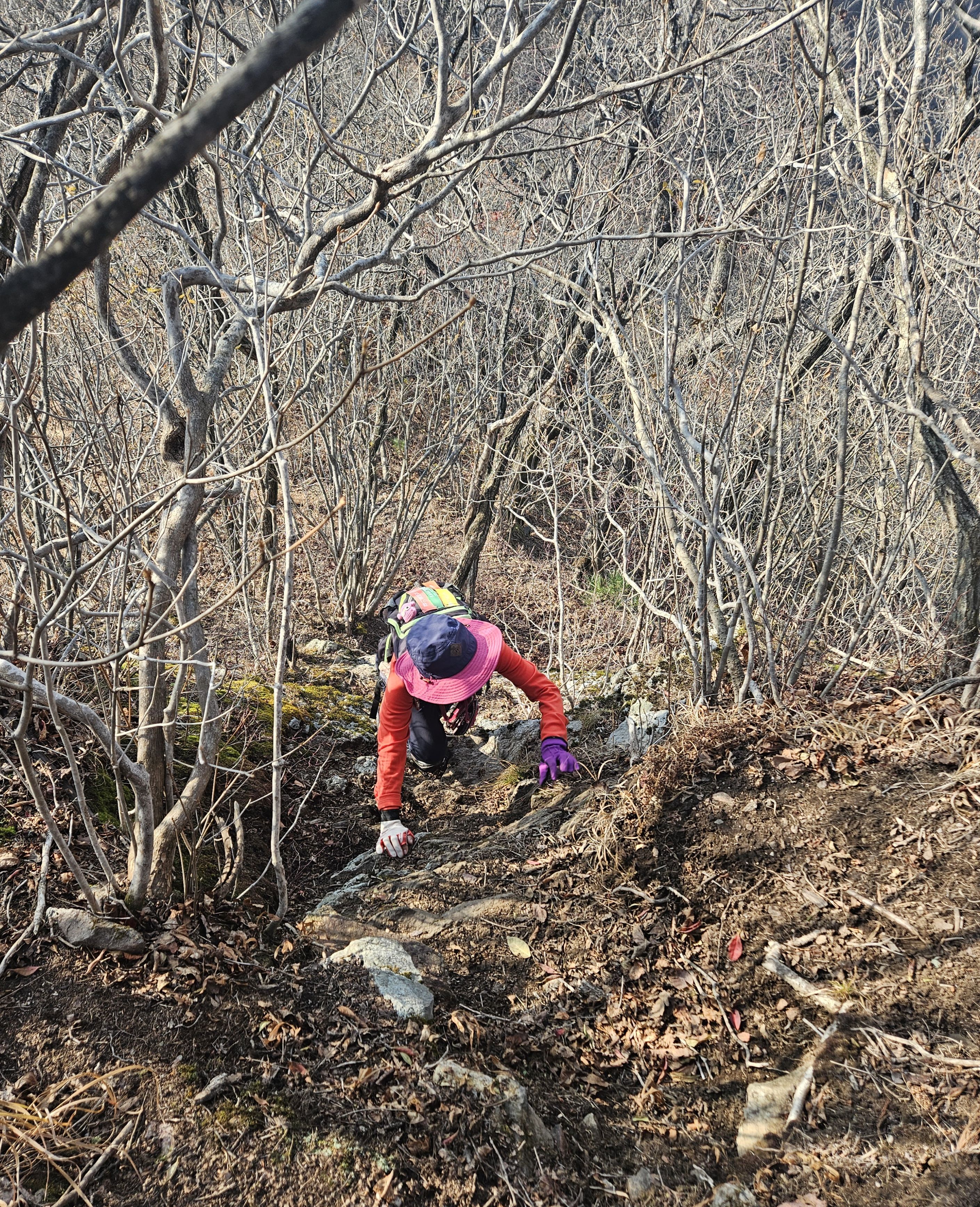 설상가상 산죽군락지 어찌나 많았는지 산죽에 갇혀서 헤어 나오느라 참말로 생고생... 또 하나 더 멱줄기 풍성했던 여름날에나 힘들줄 알았는데 아니올시다 줄기만 남았는데도 온몸을 끌어당기듯 위.아래 사방으로 걸려서 이 또한 헤치고 나오느라 진땀 났습니다.