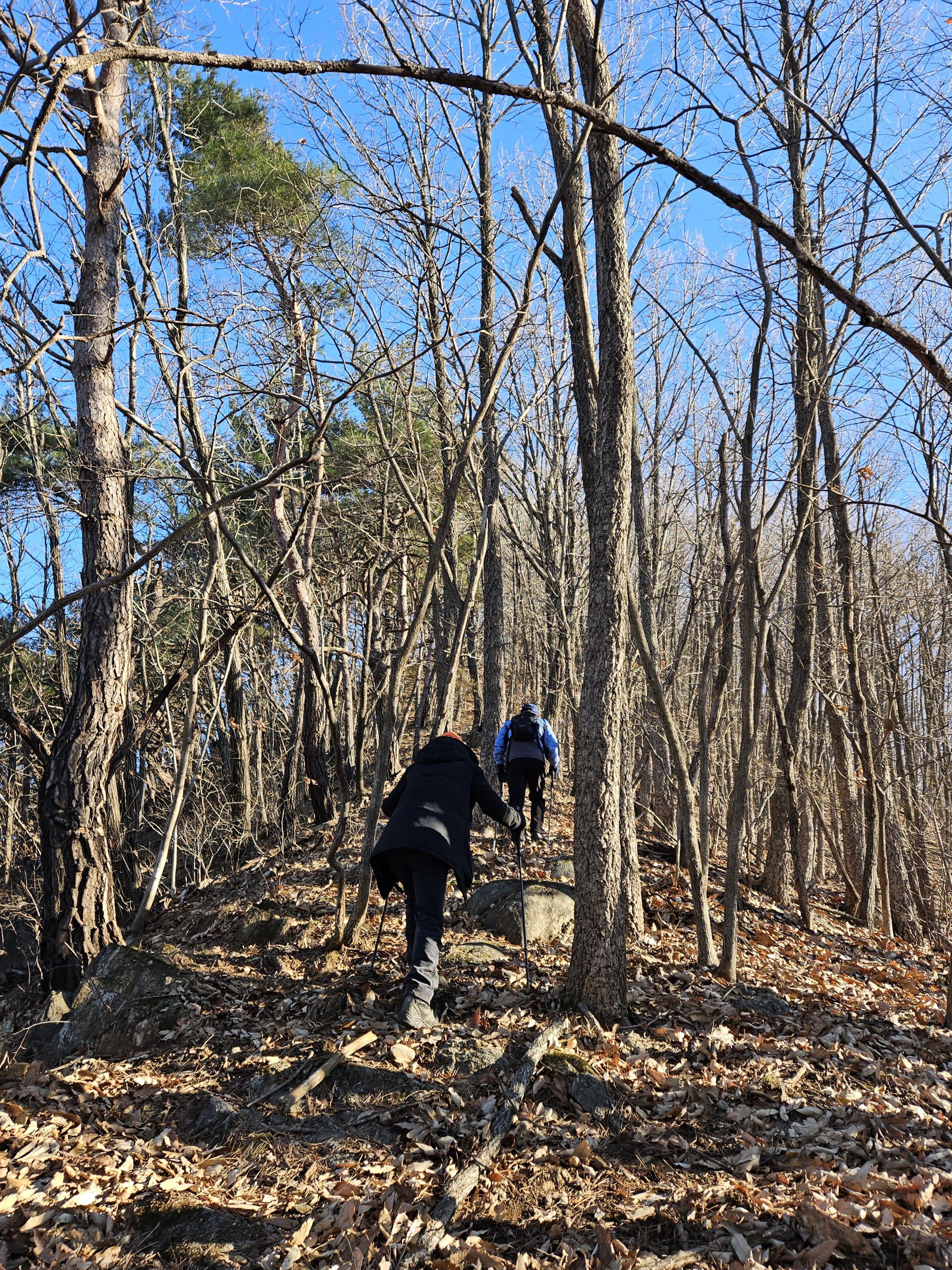 낙엽이 많이 쌓였고 낙엽에 숨겨진 자갈(돌) 때문에 많이 미끄러웠습니다.