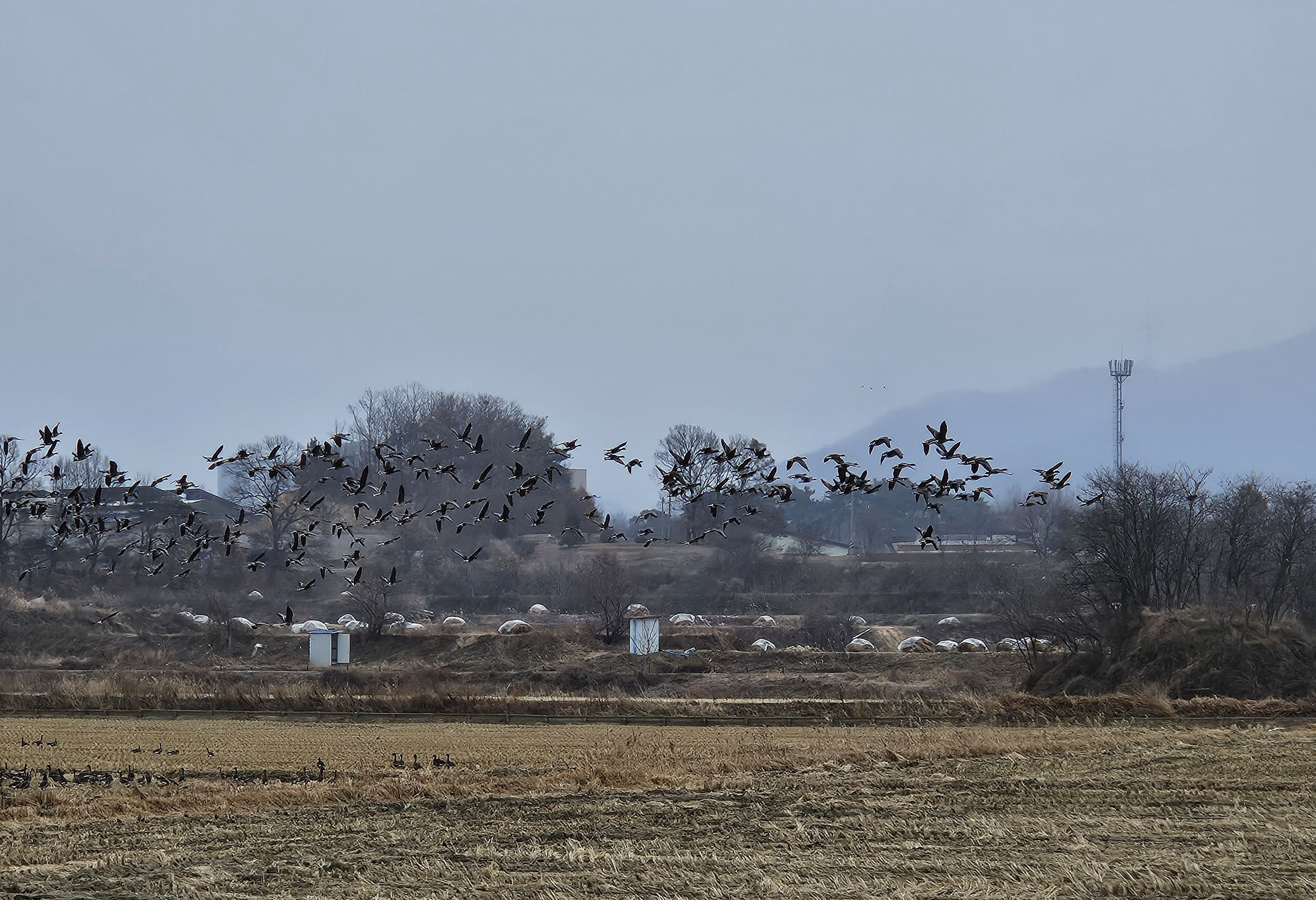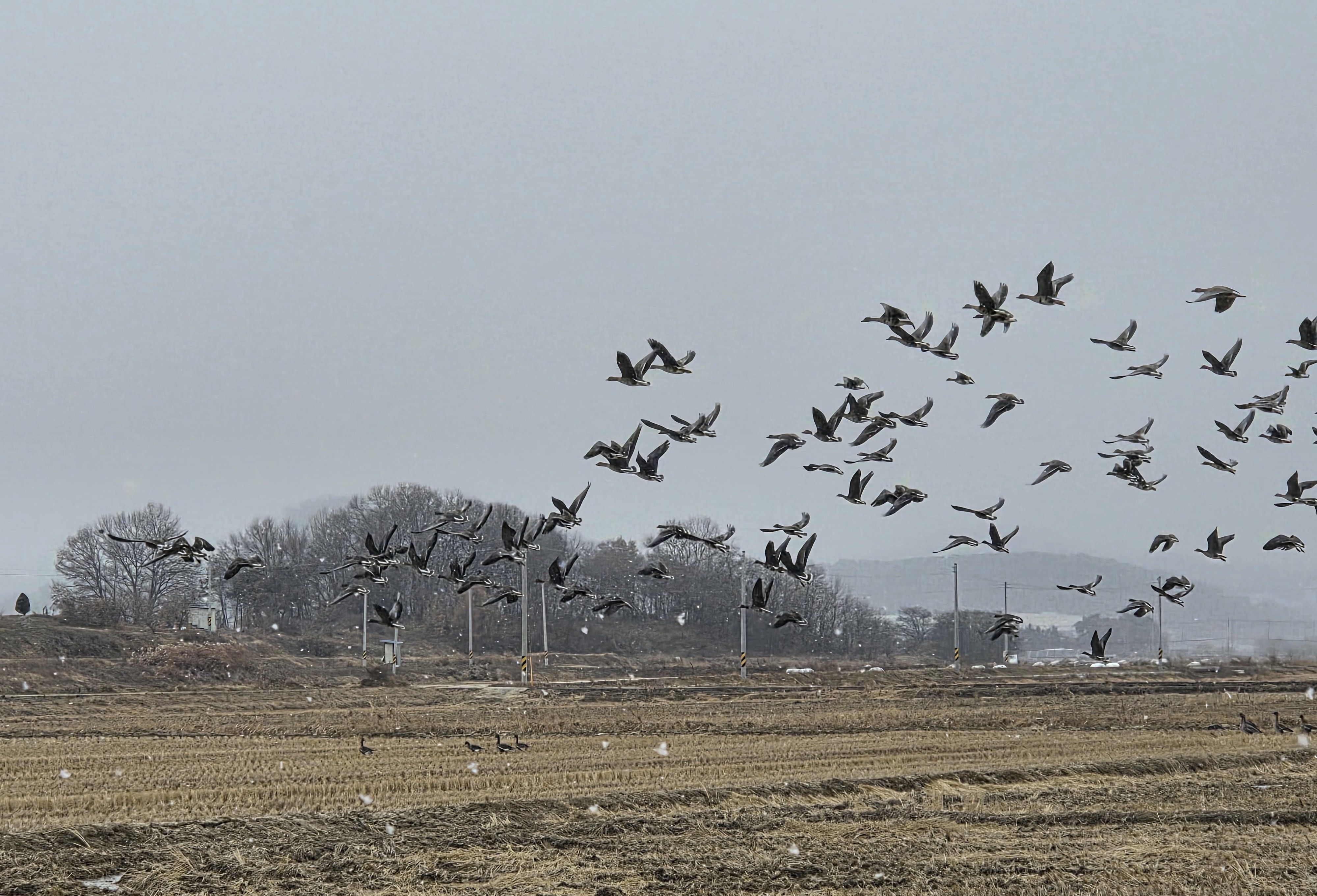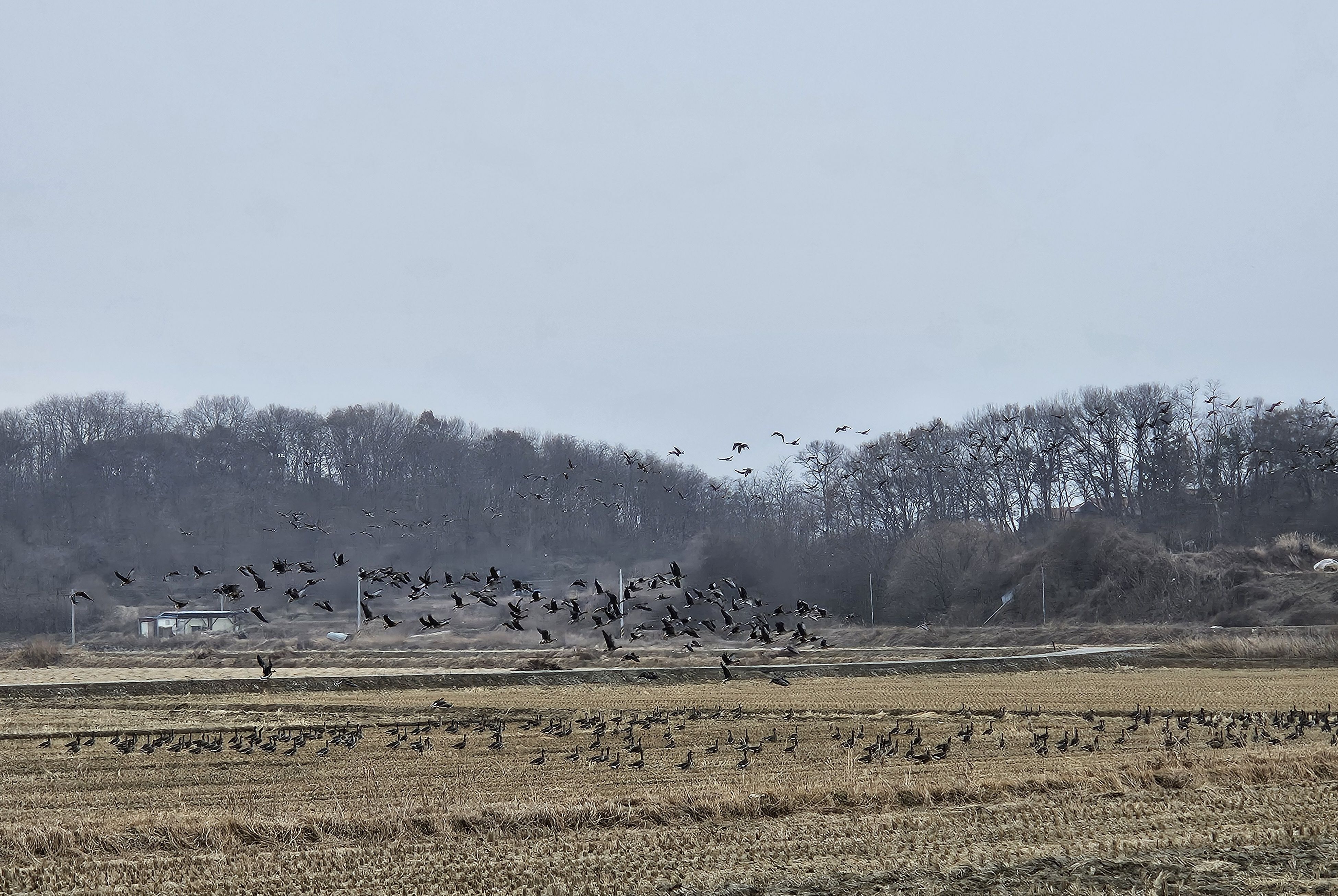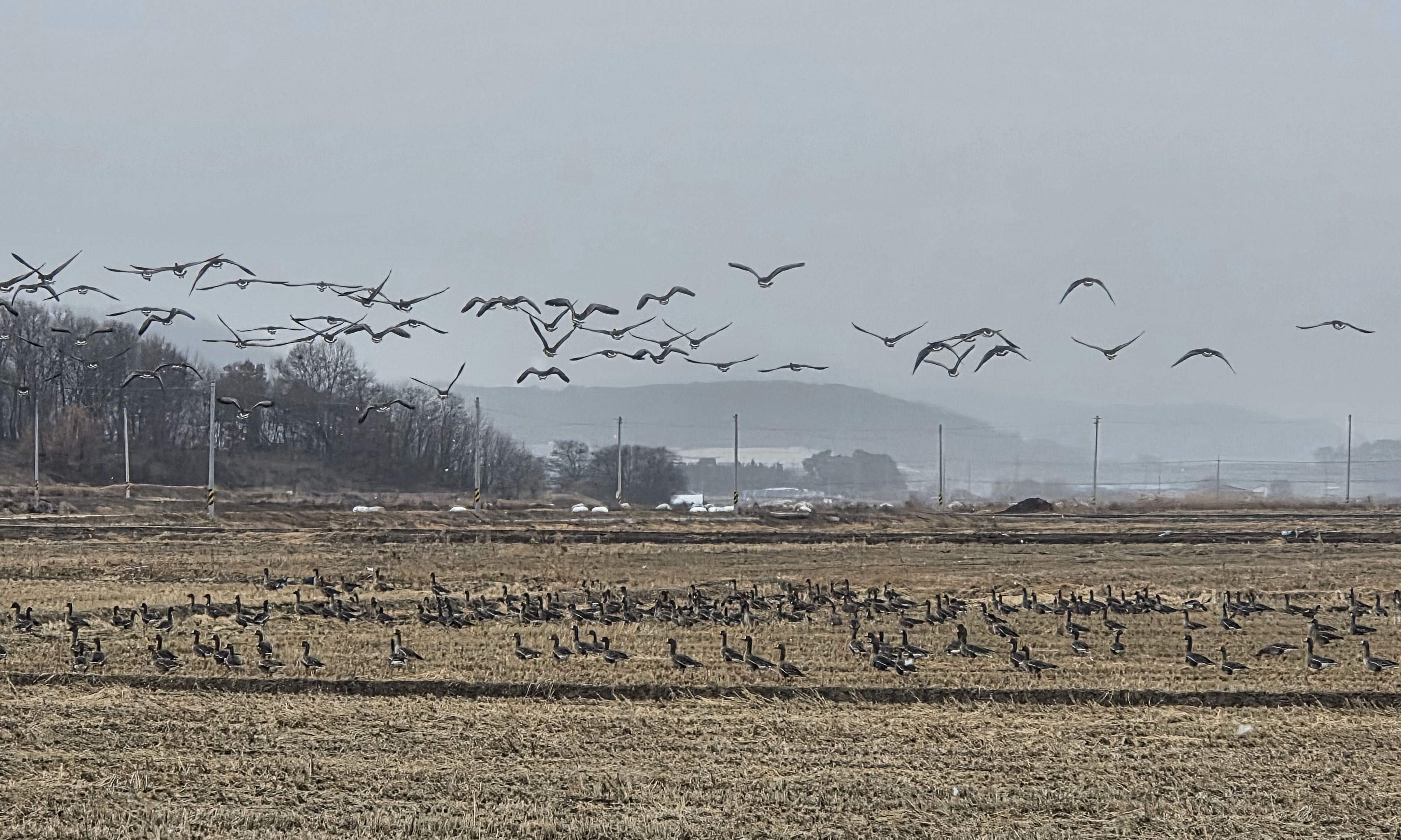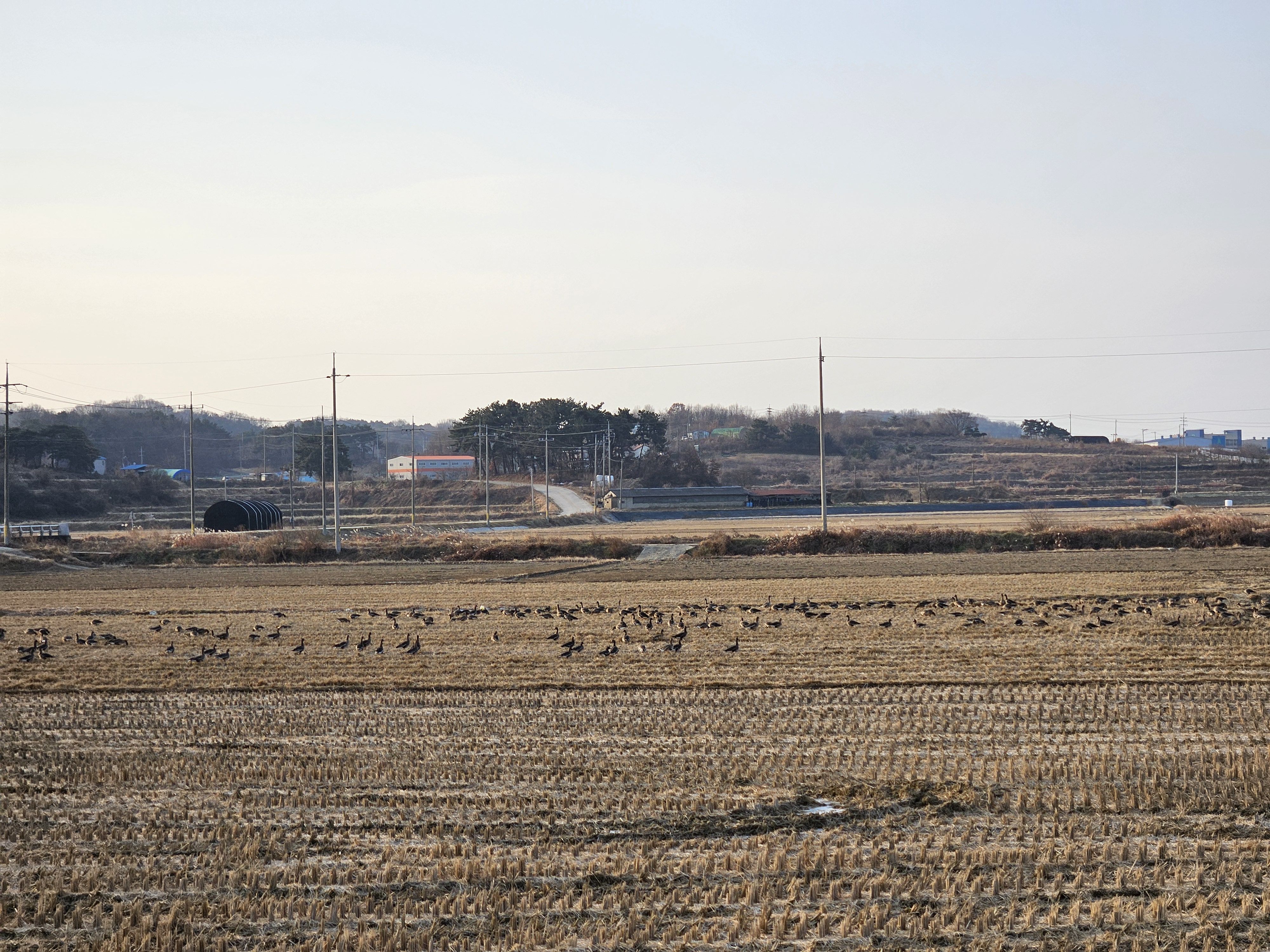 평택호/아산호 위 서해선 철길을 조망삼아 걷다보니 지루함 까지 잊게 되더라구요 장거리 임에도 불구 그다지 먼거리로 느껴지지 않았던 트레킹길 그 중 더 기분 좋았던것은 논에서 모이찾는 *기러기떼* 정말 많은 무리를 보게 되었는데 논 가운데까지 직접 방문해서 기러기떼 날려 주신 송림님 덕분에 기러기떼 하늘까지 수놓았던 장면 아~~~감격 이었습니다.(감사했습니다.)