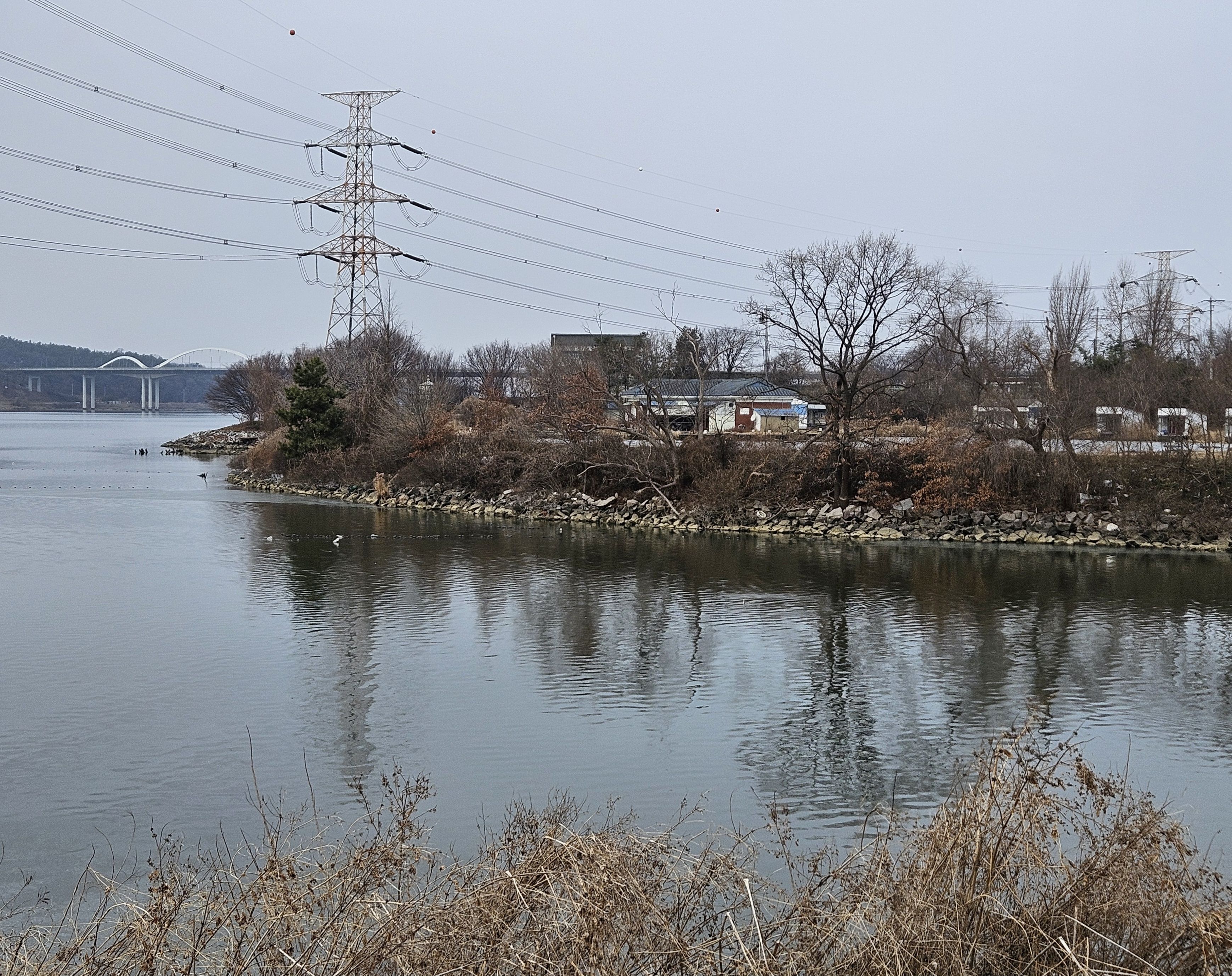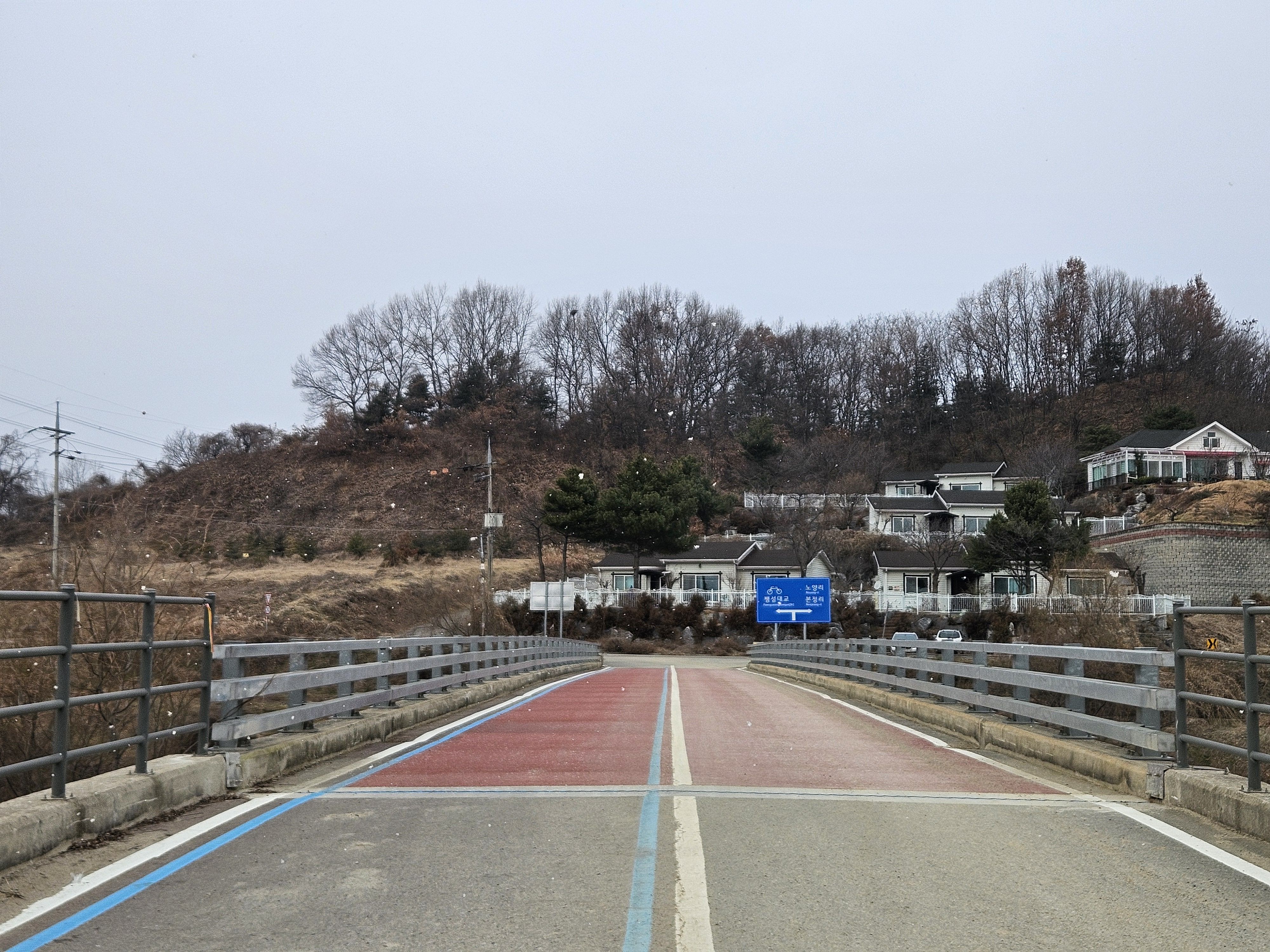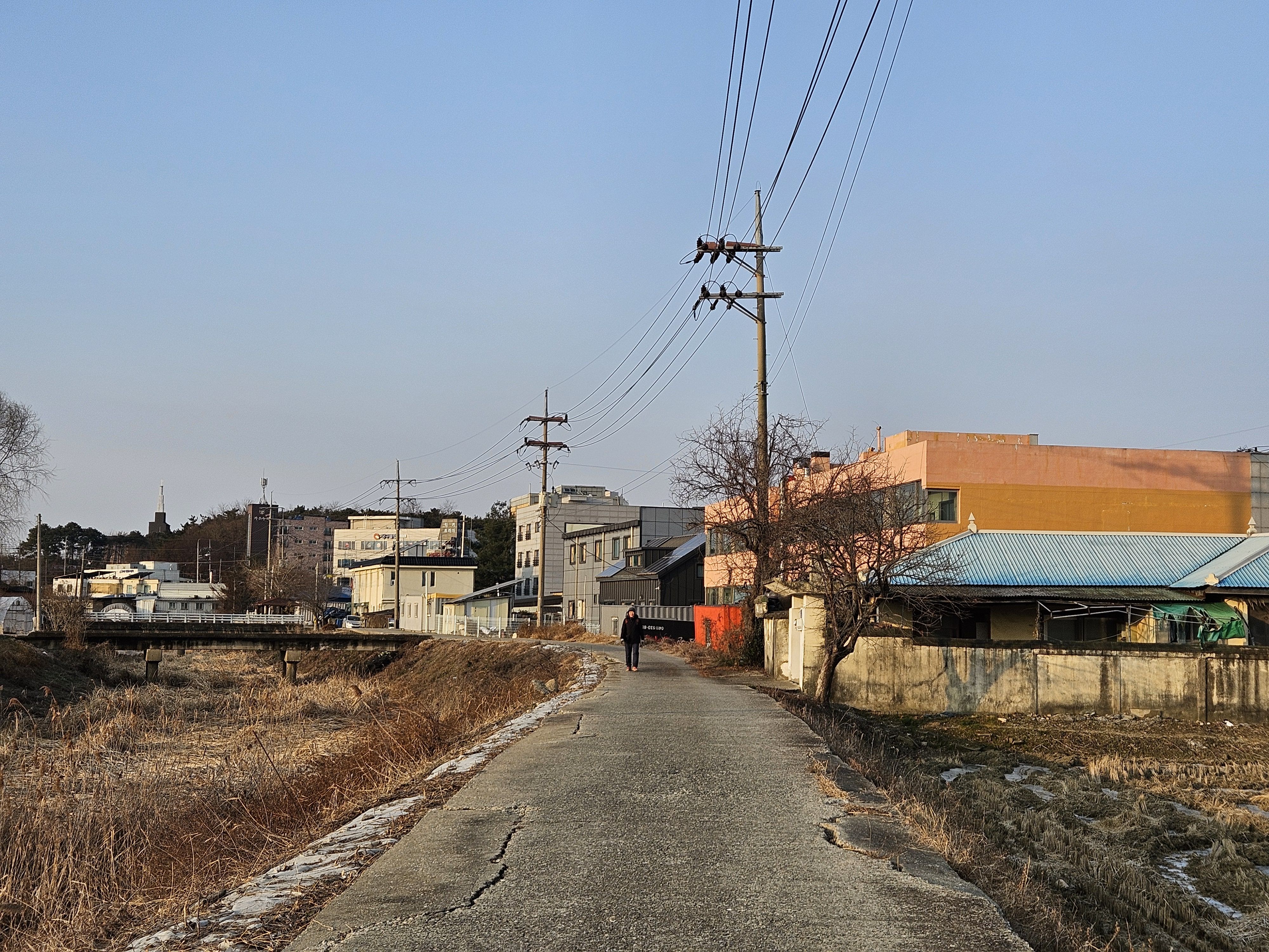 작은 개천을 빙그레 돌아서 와야 하는 길 이었는데 저는 왼쪽 (여기) 공사장으로 과감히 통과하고 건넜습니다. (많이 단축)