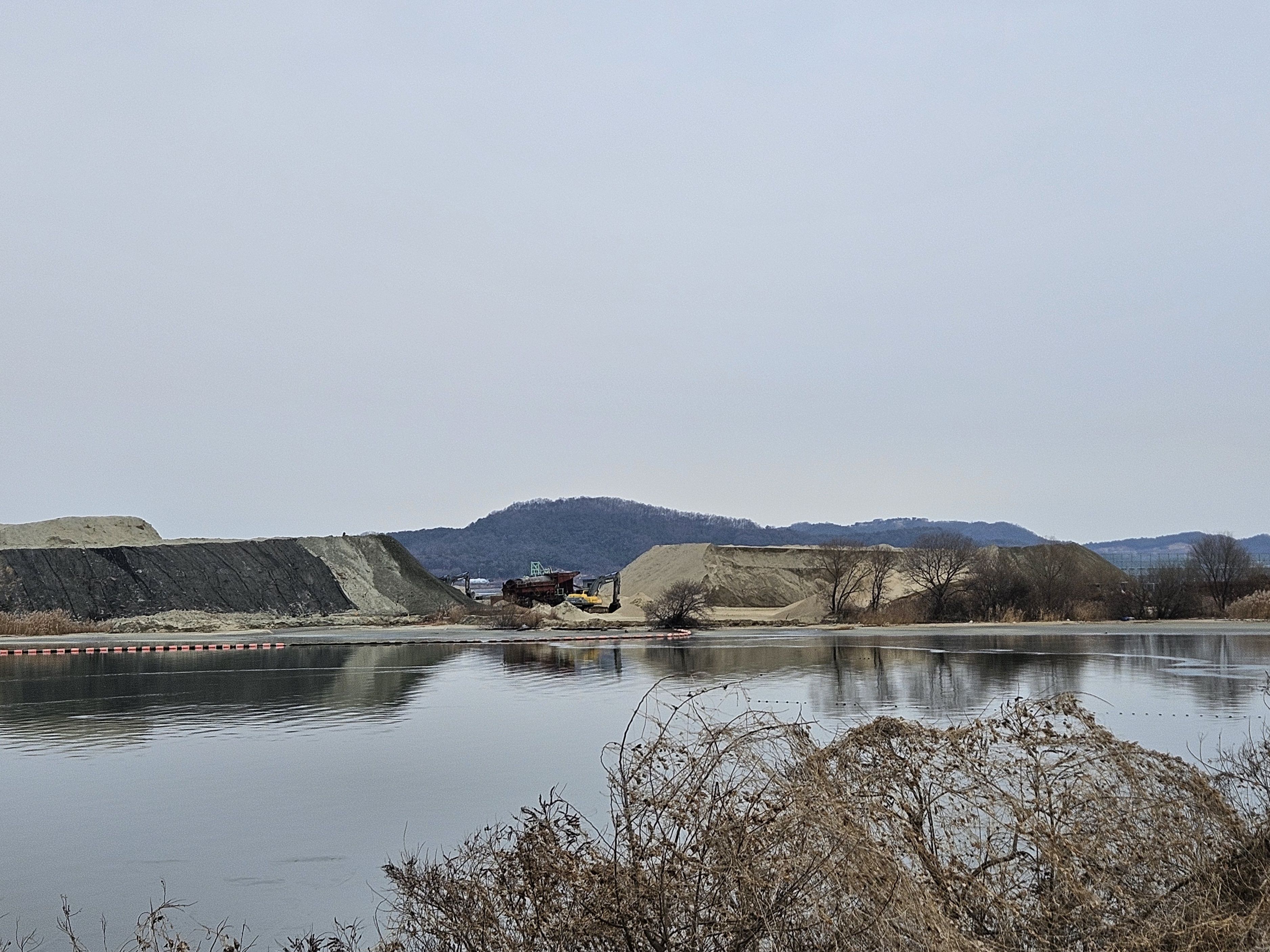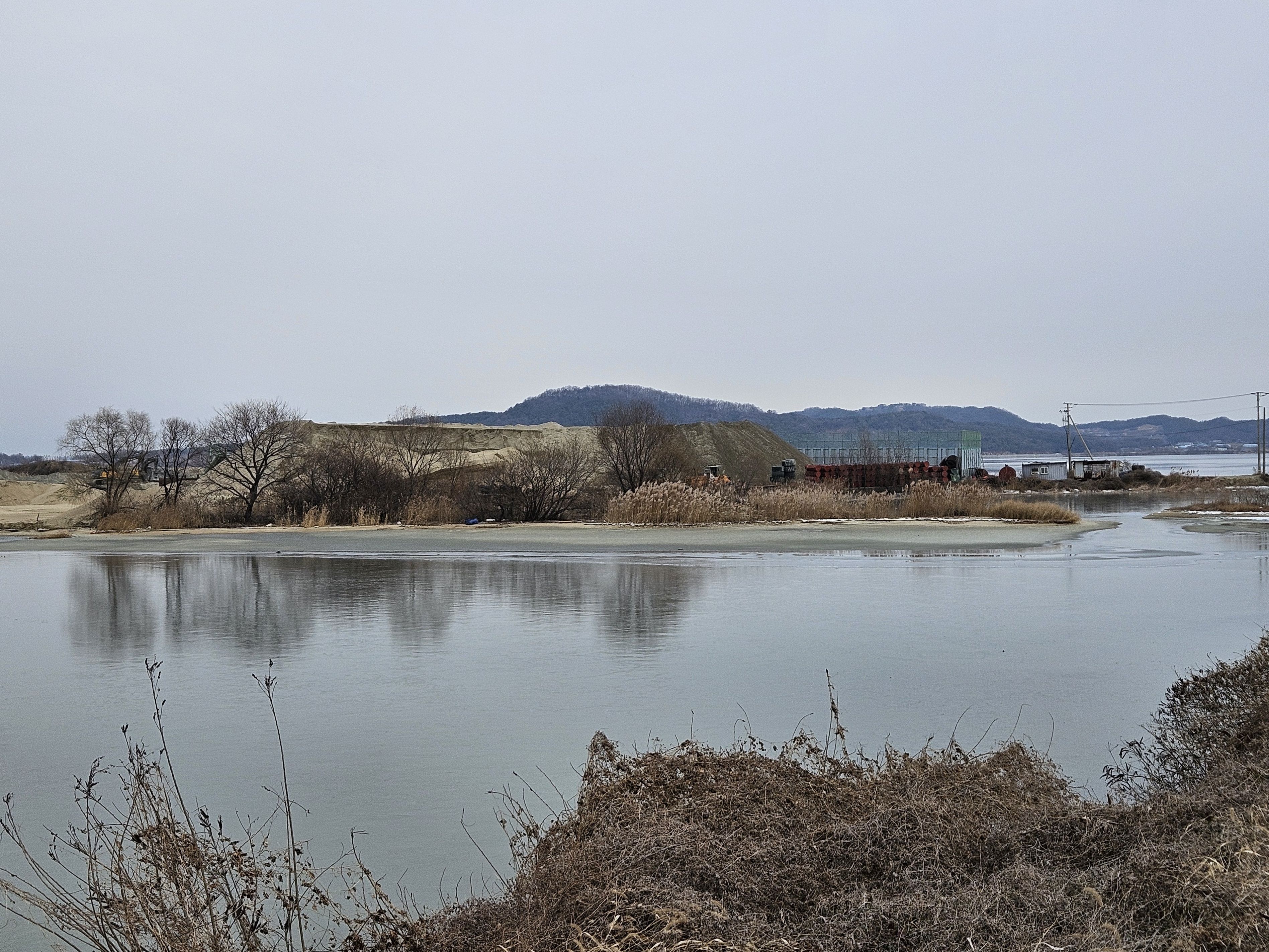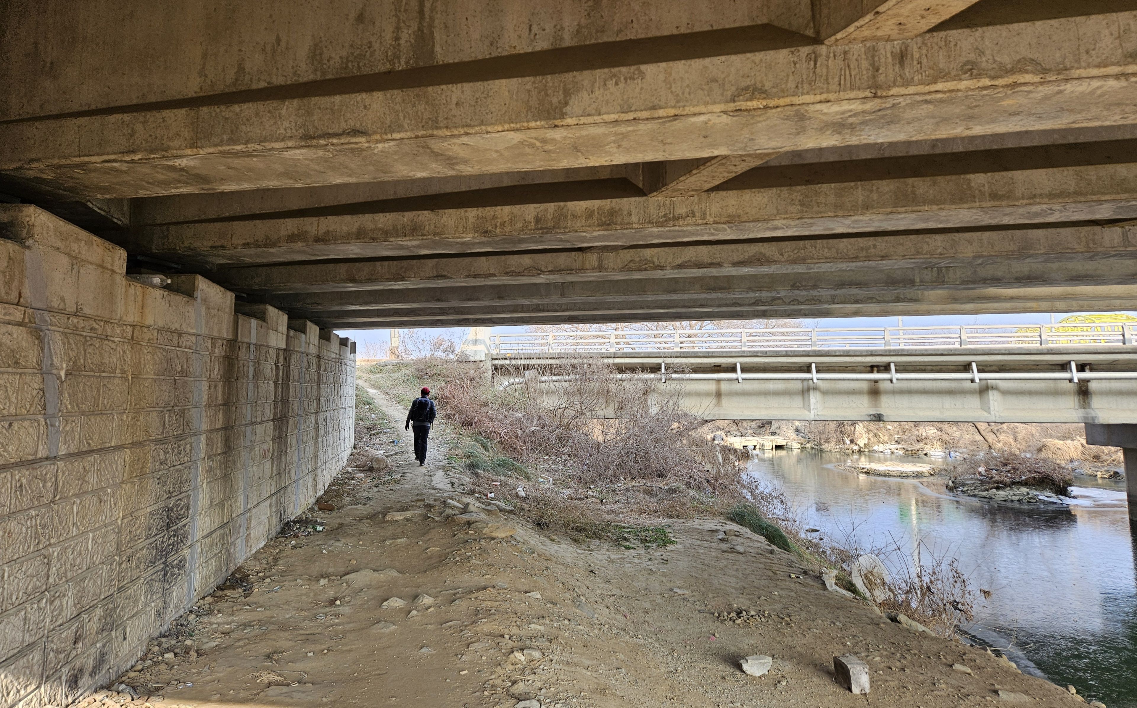 작은 개천을 빙그레 돌아서 와야 하는 길 이었는데 저는 왼쪽 (여기) 공사장으로 과감히 통과하고 건넜습니다. (많이 단축)