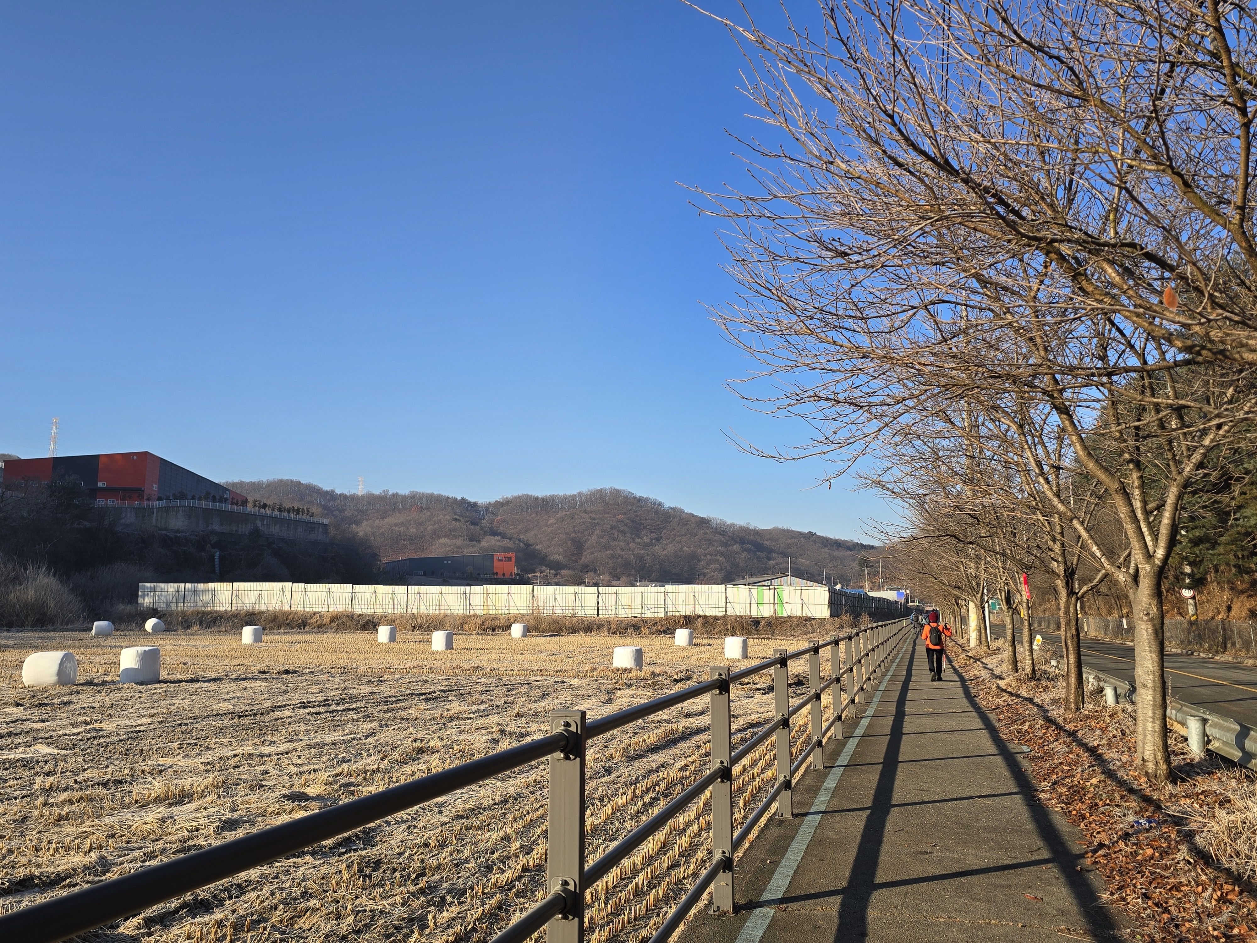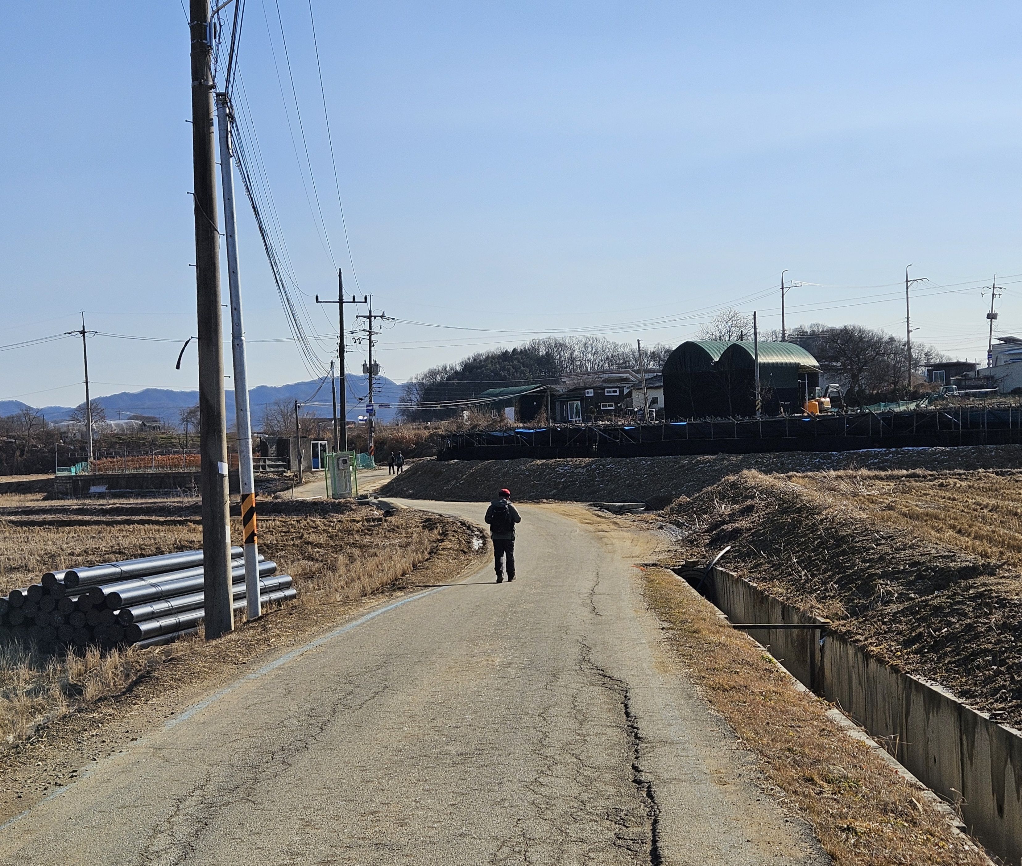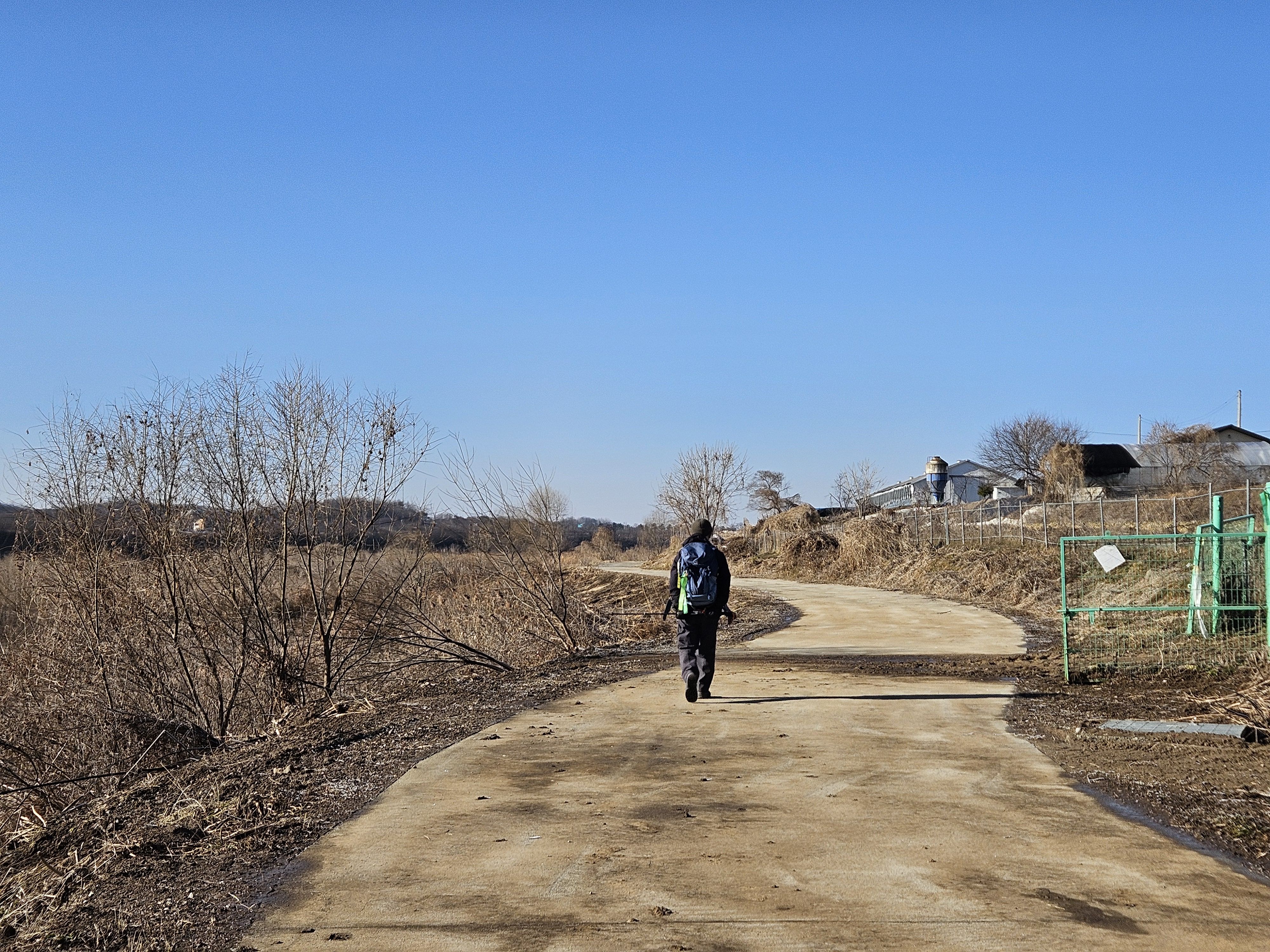 사미천 징검다리 위험하다고 임시 철거로 긴 사미천 돌아돌아 (약 6km) 더 걷느라고 무지 지루하고 다리.발목.맘.까지 아프다 보니 왕 짜증스럽더라구요 저는 올 4월에도 똑 같은 코스 (1시간20분 단축) 걸었는데 그땐 두 곳 다 징검다리로 건너가다 보니 지루함 없이 재밌게 걸었는데 오늘은 제방길에서 모든 에너지 다 쏟아붓다 보니 정말 힘들었습니다. 그나마 째끔 다행은 겨울날씨답지 않고 춥지 않았기에 천만다행 이란 생각 사미천교 건넌 이후 남은 거리 그리 멀지 않았지만 어찌나 길게 느껴지던지 약 1km 남기고 트럭 앵벌이 해서 종점도착 (새마을지도자님 자가요)