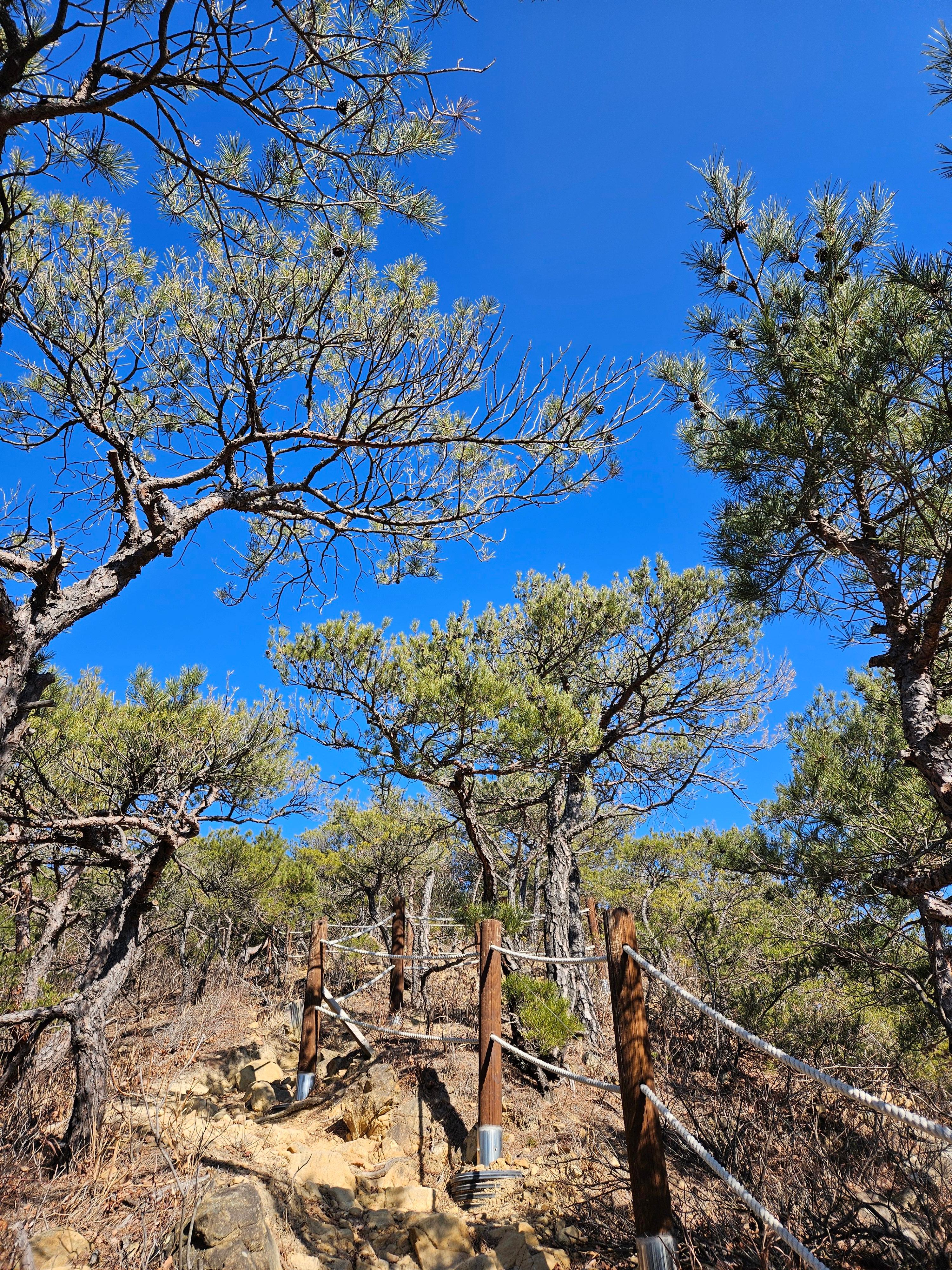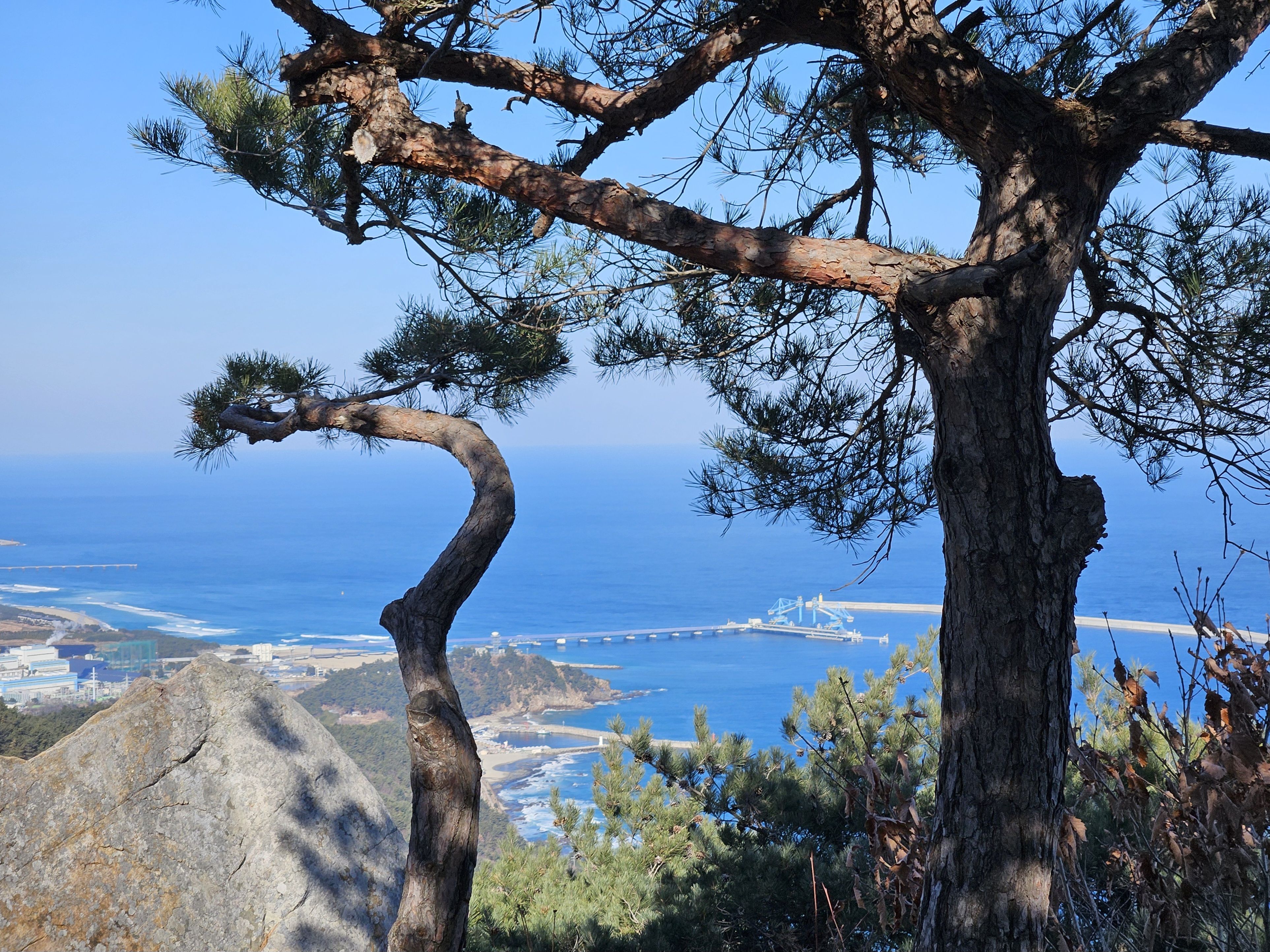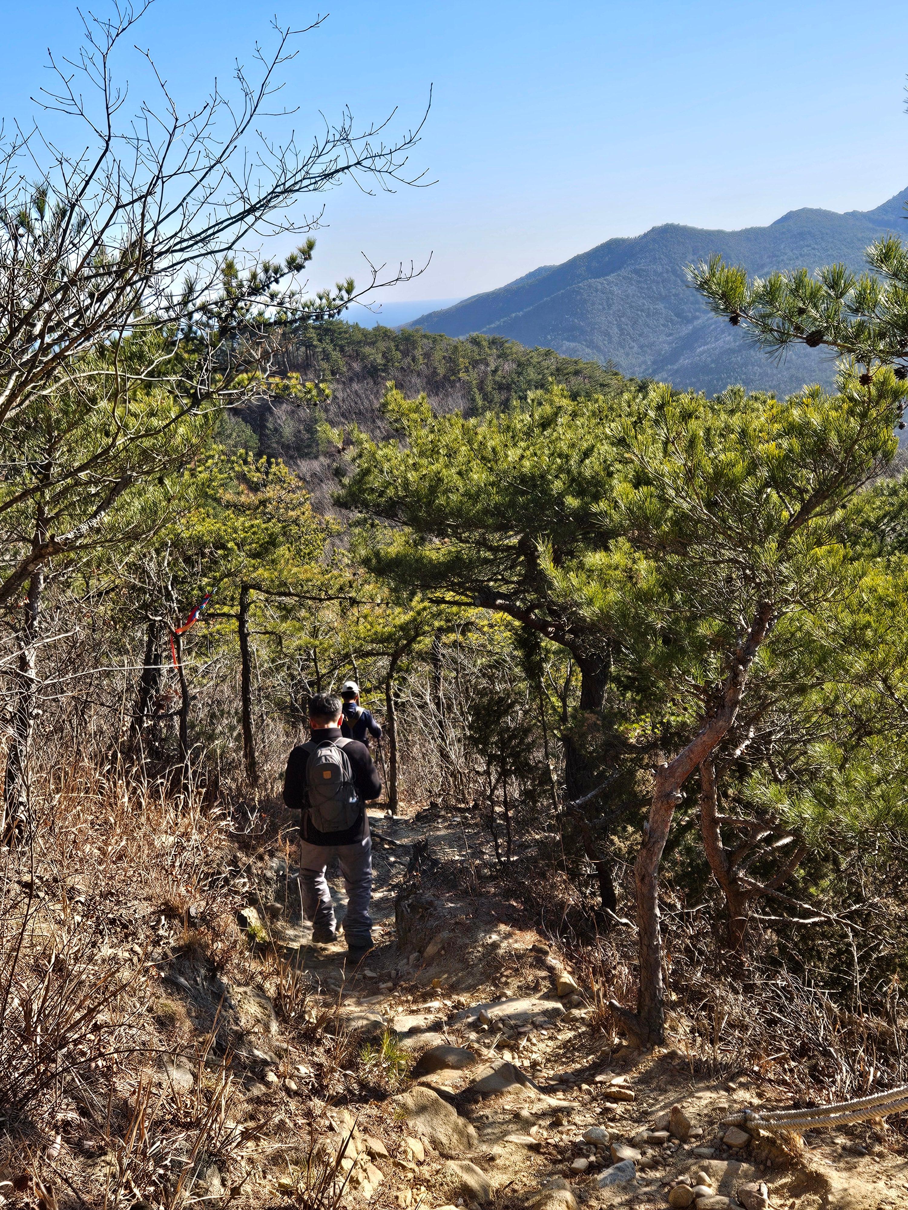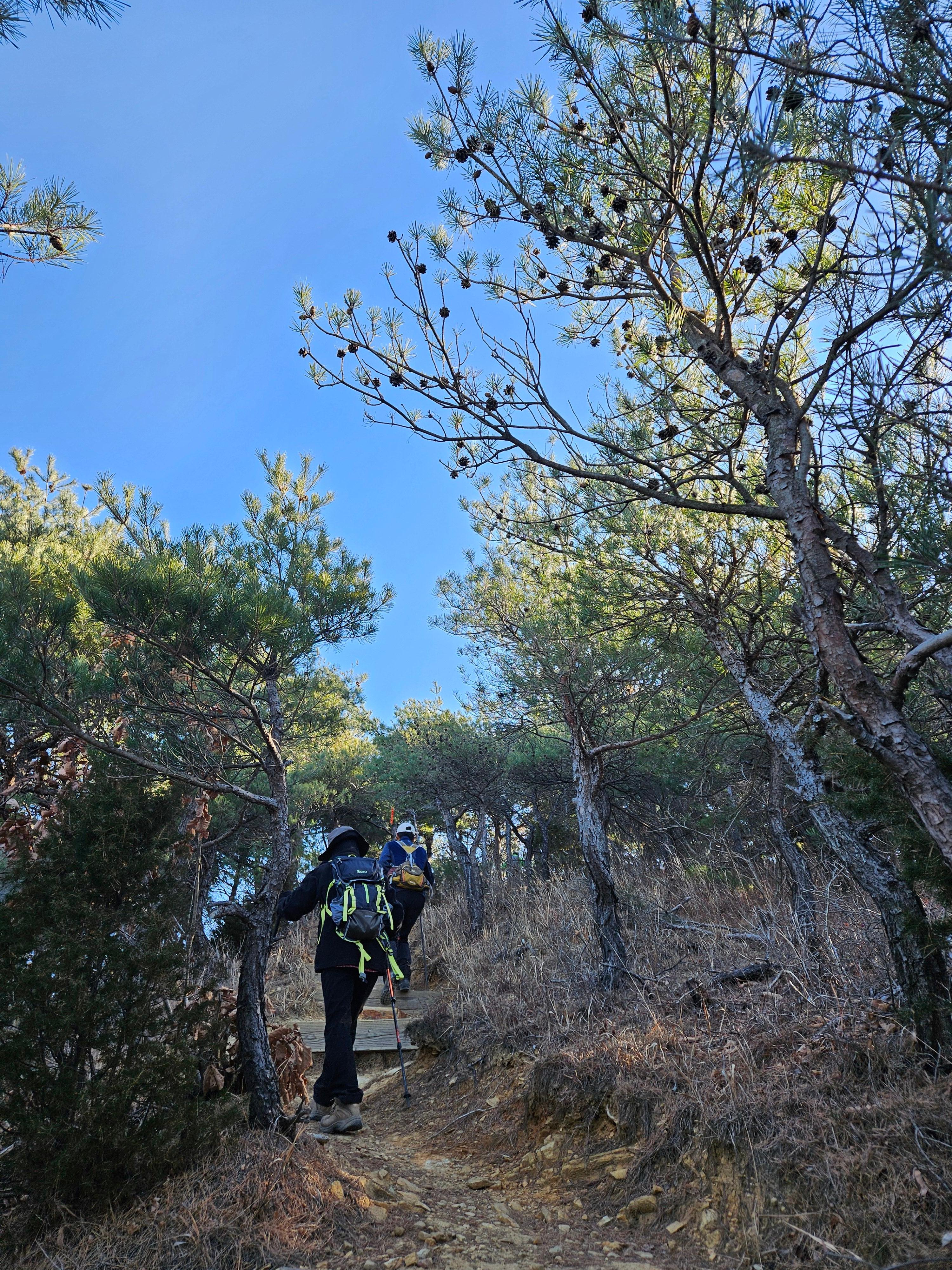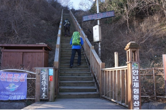 하차 후 첫걸음부터 깍아진 계단길 아이고 숨이 턱~~~계단길 오르고나니 등로는 명산답게 아주 좋았습니다. 산 높이를 더해 가면서 어느새 땀 나기시작. 바람막이 벗기 시작... 간간히 보게되는 바다 조망은 경치는 일품이었습니다. 맑고 깨끗한 하늘 덕분에 바다는 더 푸르게 푸르게 보였는데 큰 너울성파도까지 볼거리 제공 해 주어 새해 첫 산행 산뜻한 기분 참 행복했습니다.