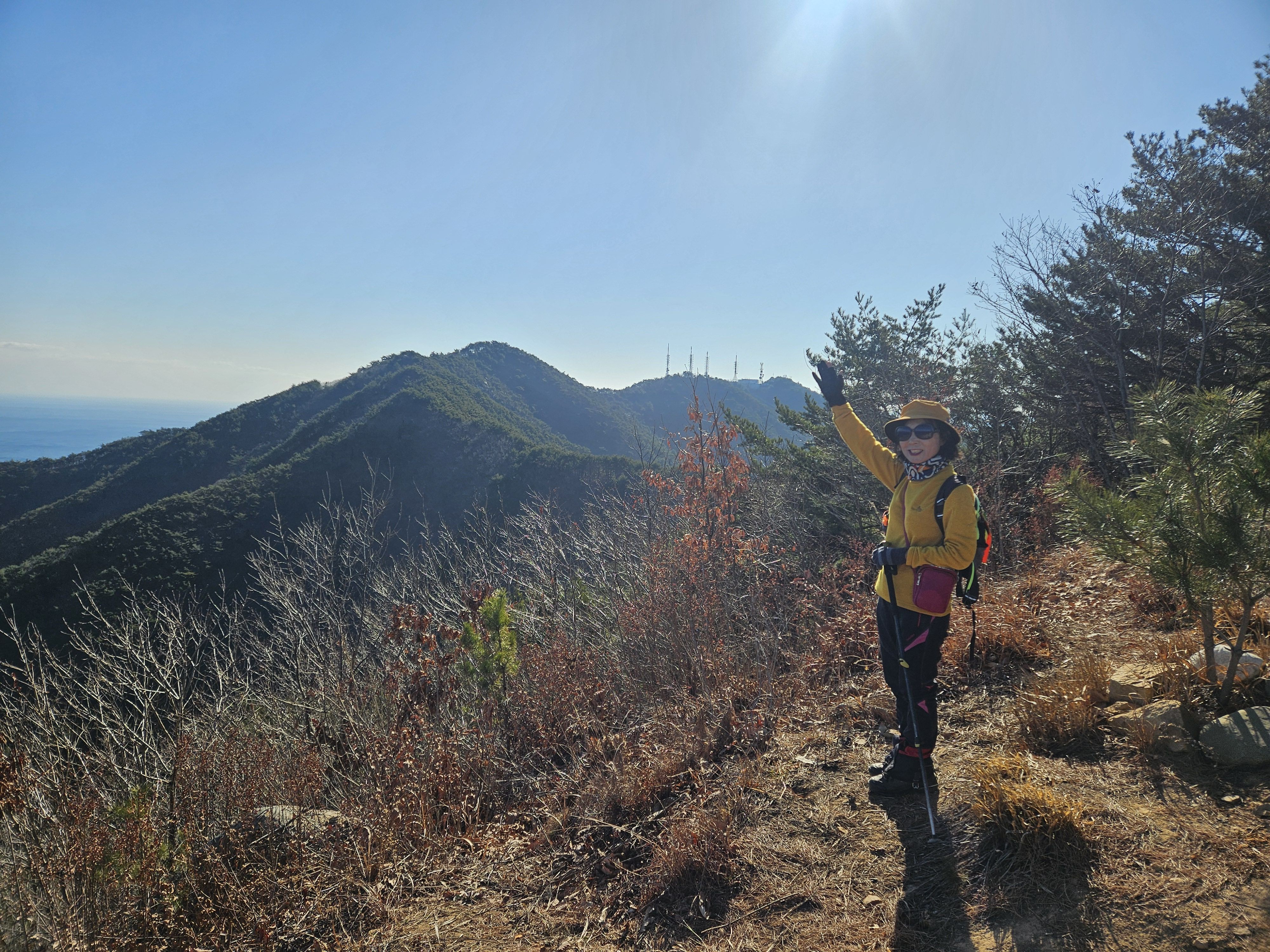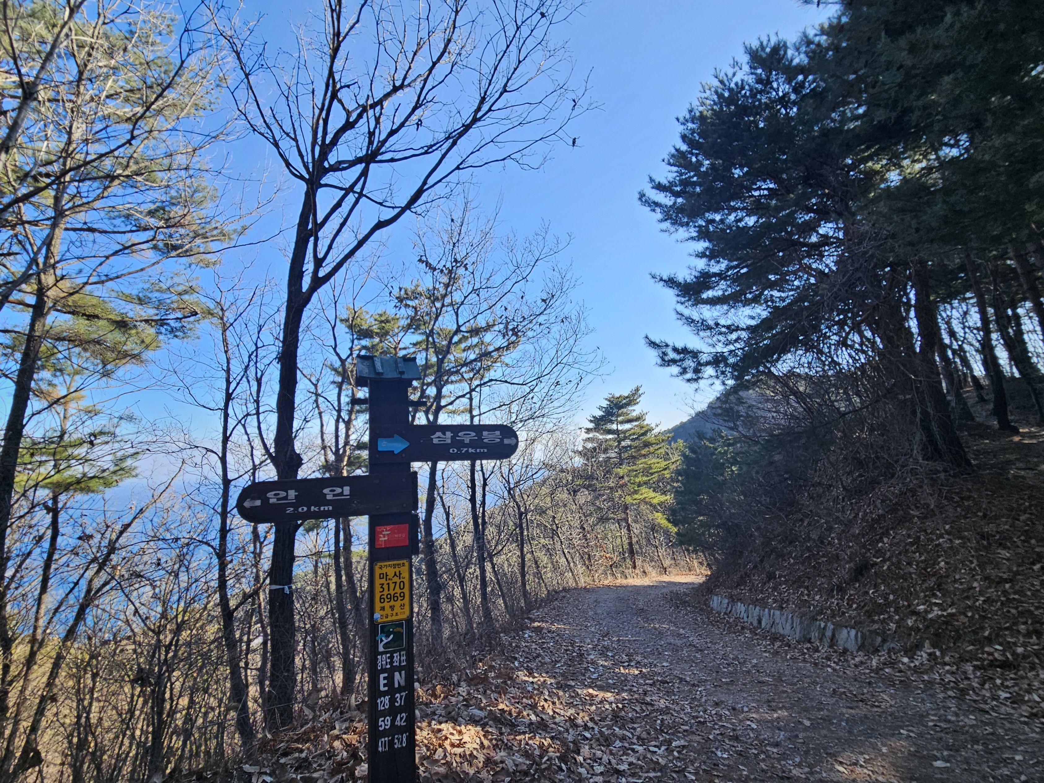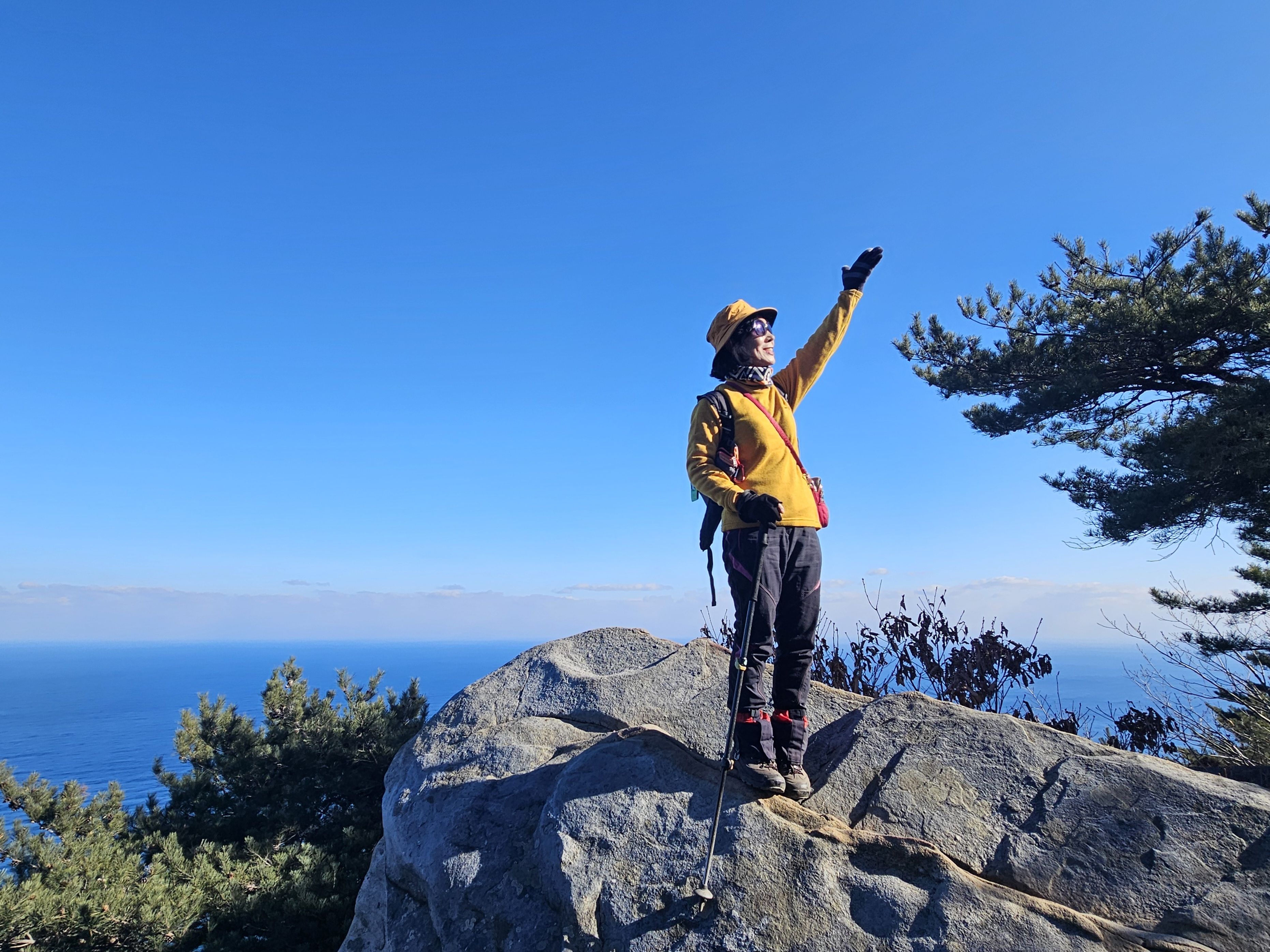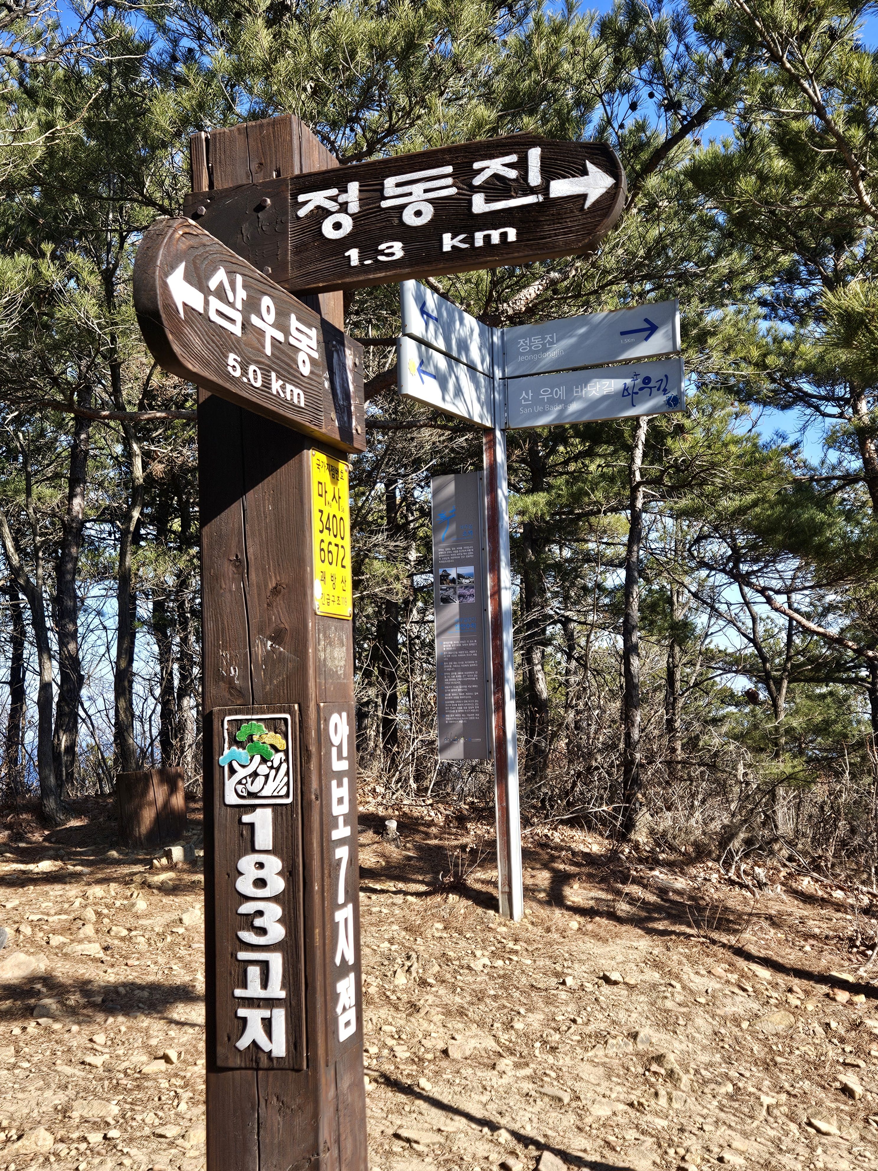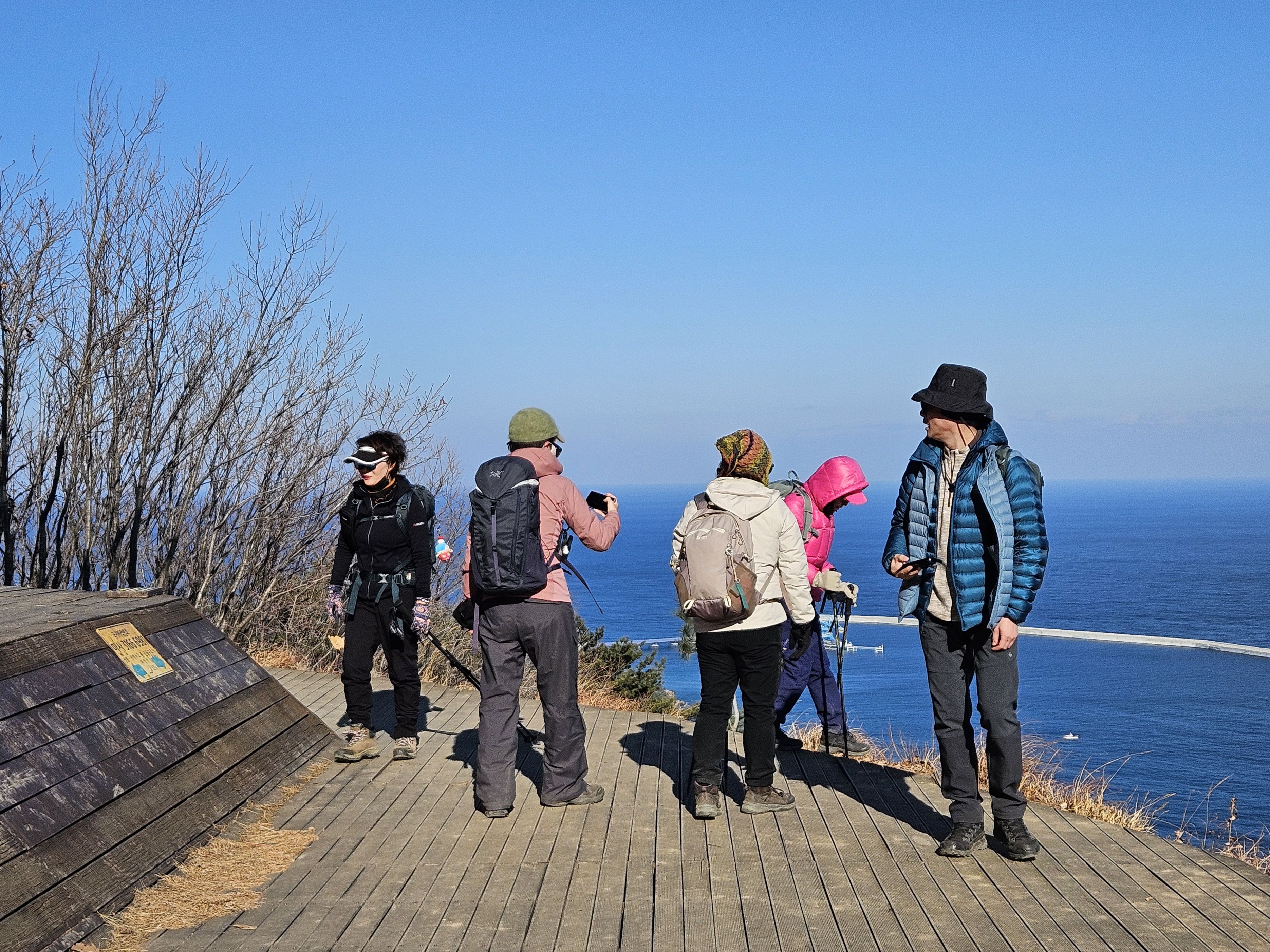 하차 후 첫걸음부터 깍아진 계단길 아이고 숨이 턱~~~계단길 오르고나니 등로는 명산답게 아주 좋았습니다. 산 높이를 더해 가면서 어느새 땀 나기시작. 바람막이 벗기 시작... 간간히 보게되는 바다 조망은 경치는 일품이었습니다. 맑고 깨끗한 하늘 덕분에 바다는 더 푸르게 푸르게 보였는데 큰 너울성파도까지 볼거리 제공 해 주어 새해 첫 산행 산뜻한 기분 참 행복했습니다.