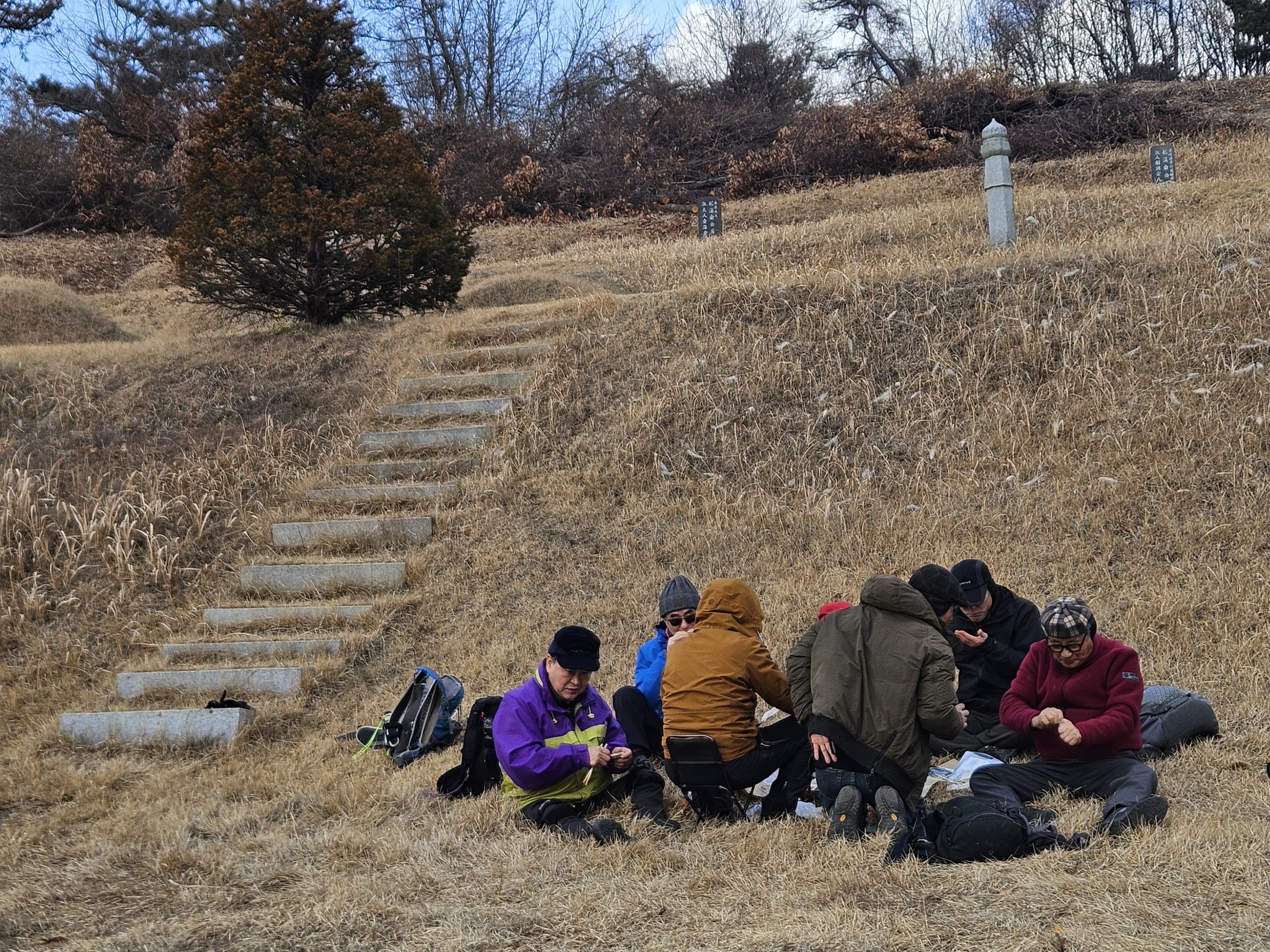 묘지 앞에서 간식 과 휴식 하시는 선두팀